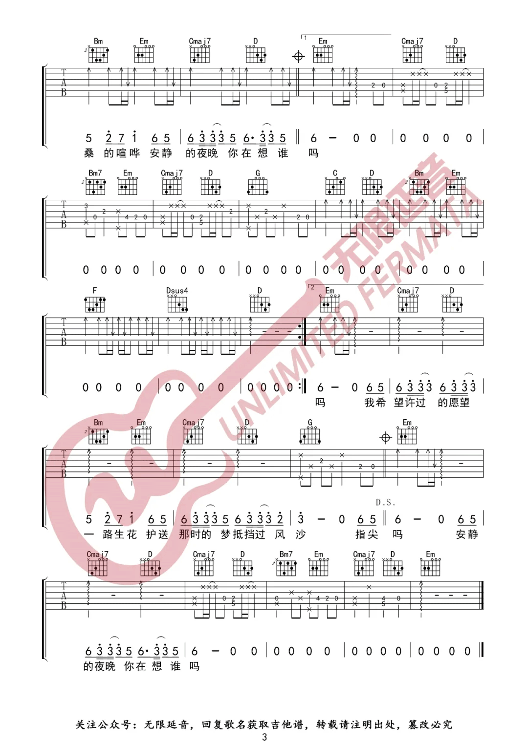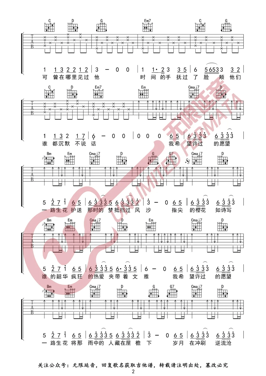 曲谱介绍: 温奕心《一路生花》吉他弹唱谱,采用G调指法编配,共有3张高清图谱。