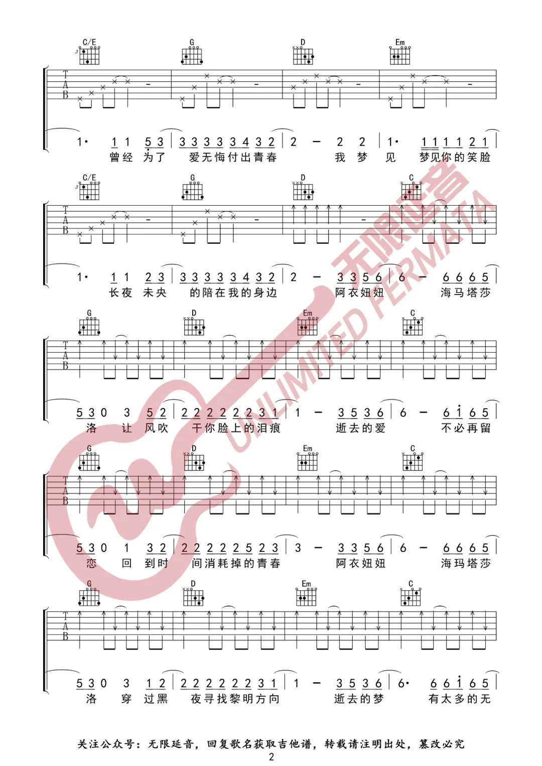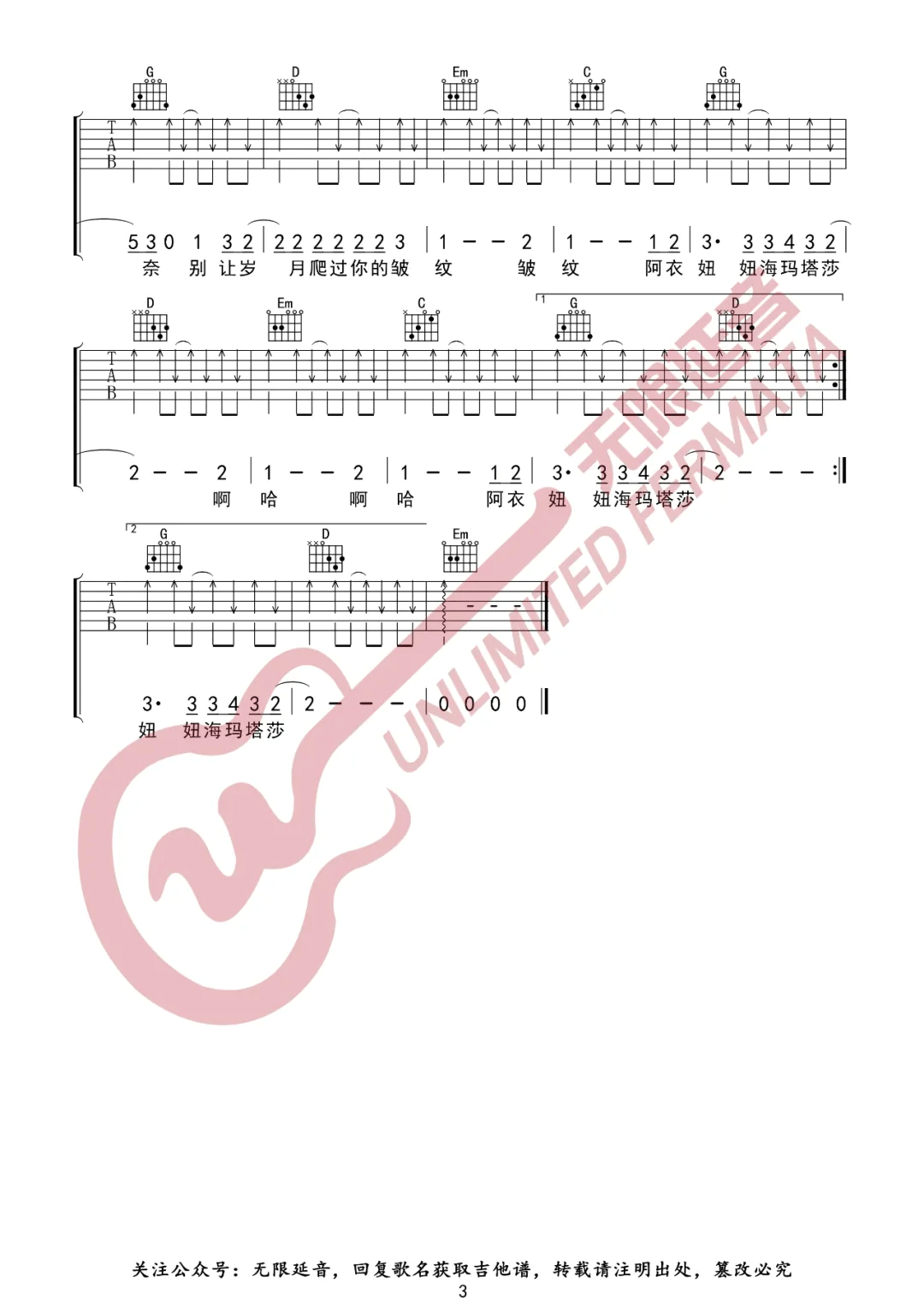 曲谱介绍: 阿吉太组合《阿衣莫》吉他弹唱谱,采用G调指法编配,共有3张高清图谱。