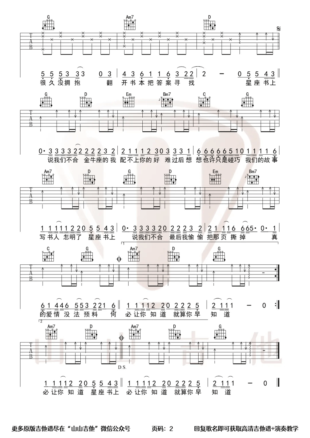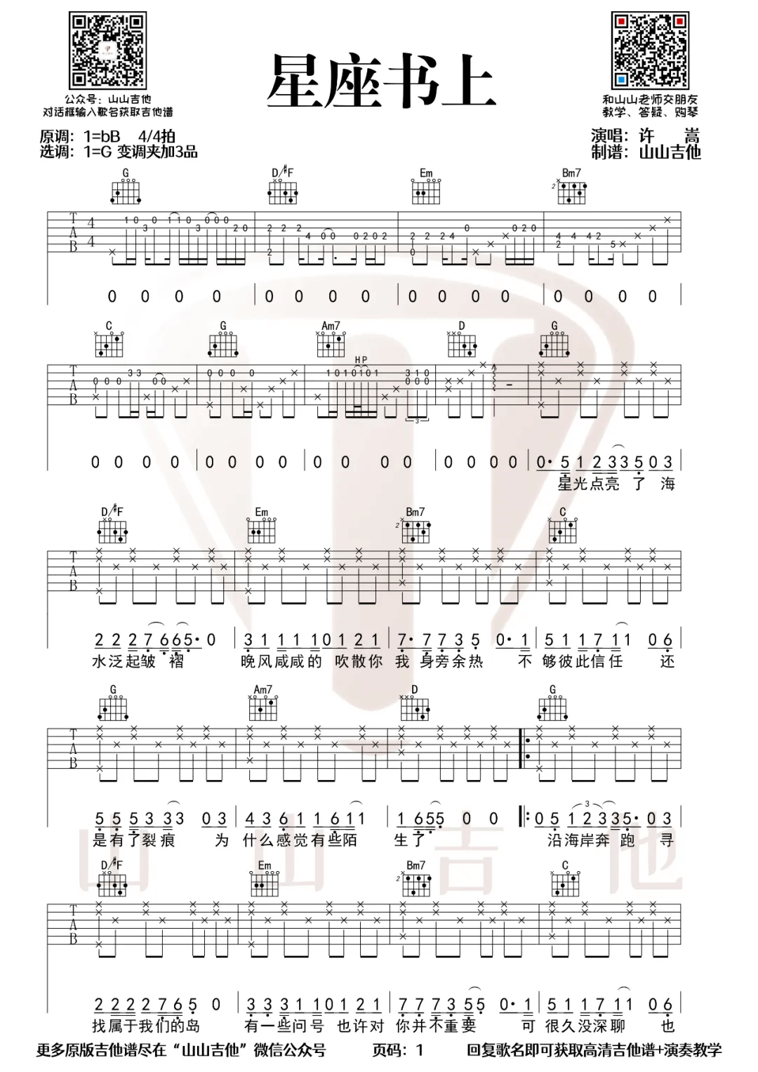 曲谱介绍: 许嵩《星座书上》吉他弹唱谱,采用G调指法编配原版,共有2张高清图谱,免翻页排版设计。