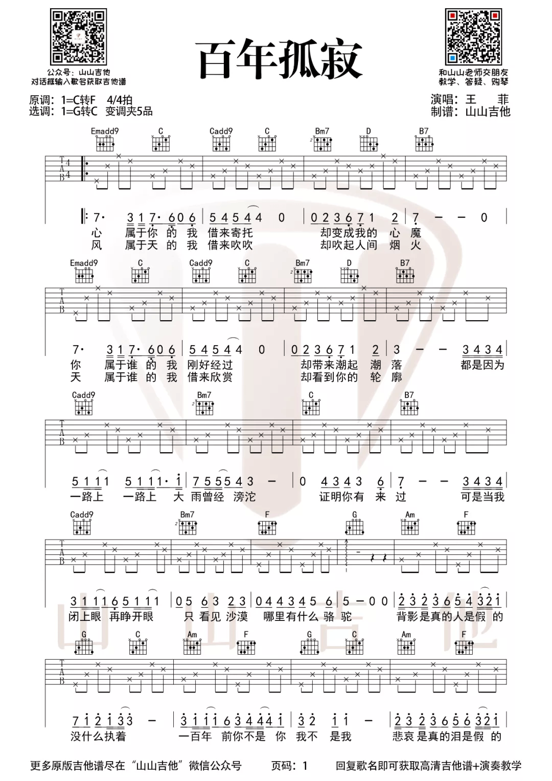 曲谱介绍: 王菲《百年孤寂》吉他弹唱谱,采用G调指法编配,共有2张高清图谱,免翻页排版设计。