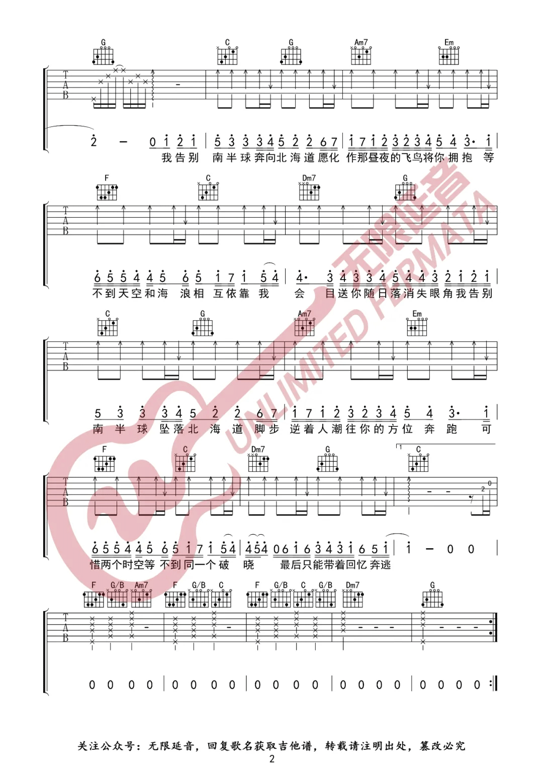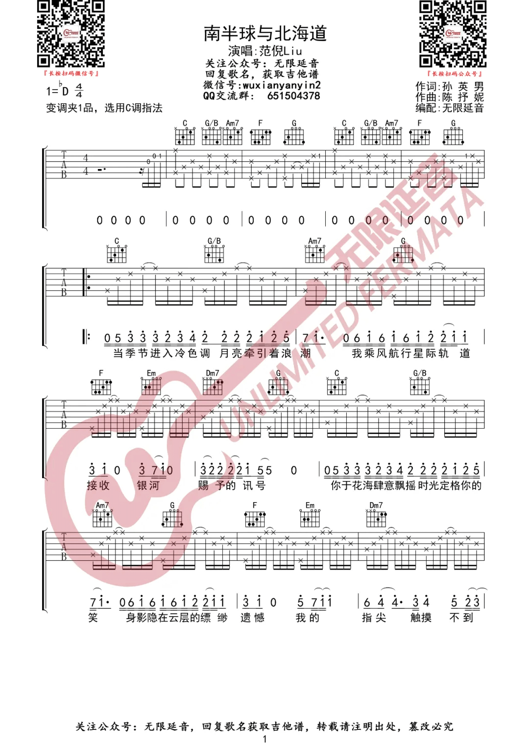 曲谱介绍: 范倪Liu《南半球与北海道》吉他弹唱谱,采用C调指法编配,共有3张高清图谱。