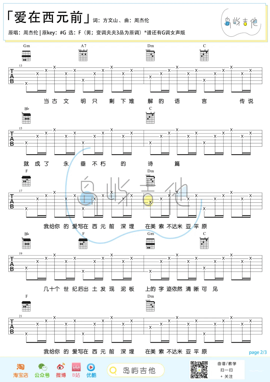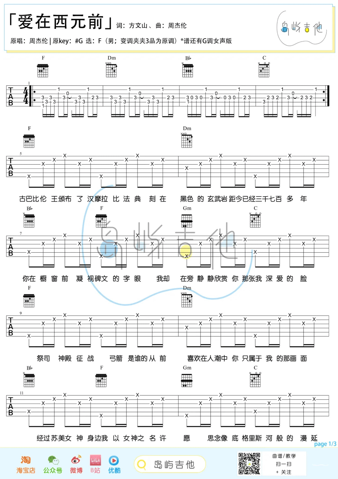 曲谱介绍: 周杰伦《爱在西元前》吉他弹唱谱,采用F调指法编配,共有3张高清图谱。