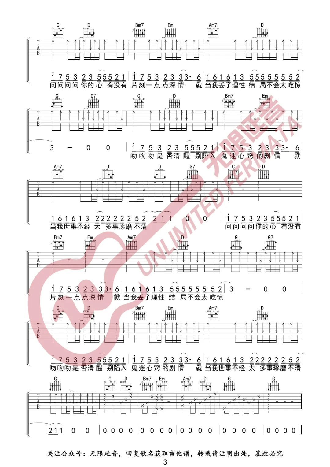 曲谱介绍: 就是南方凯《问心》吉他弹唱谱,采用G调指法编配,共有3张高清图谱。