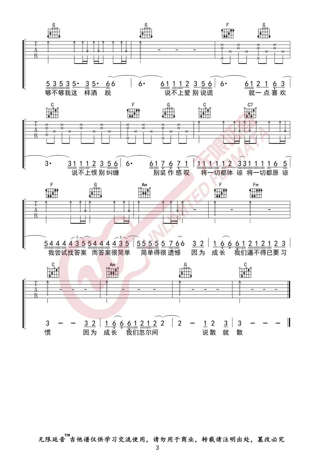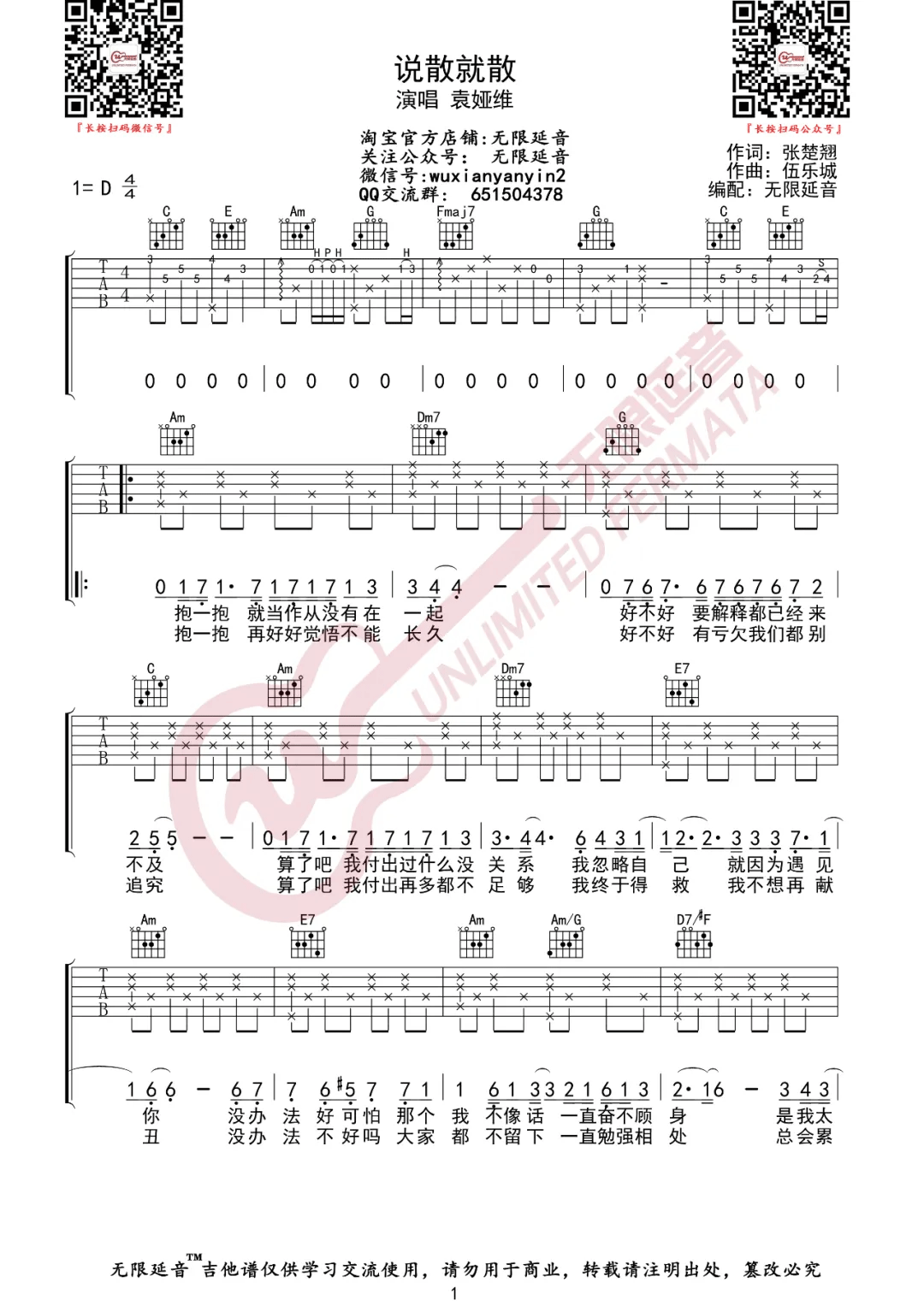 曲谱介绍: 袁娅维《说散就散》吉他弹唱谱,采用C调指法编配原版,共有3张高清图谱。