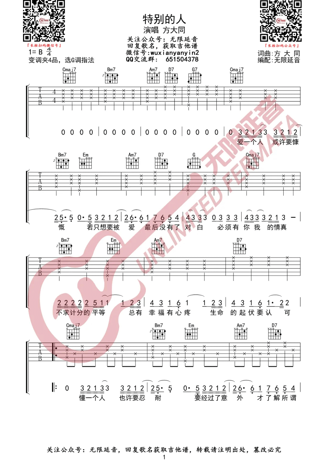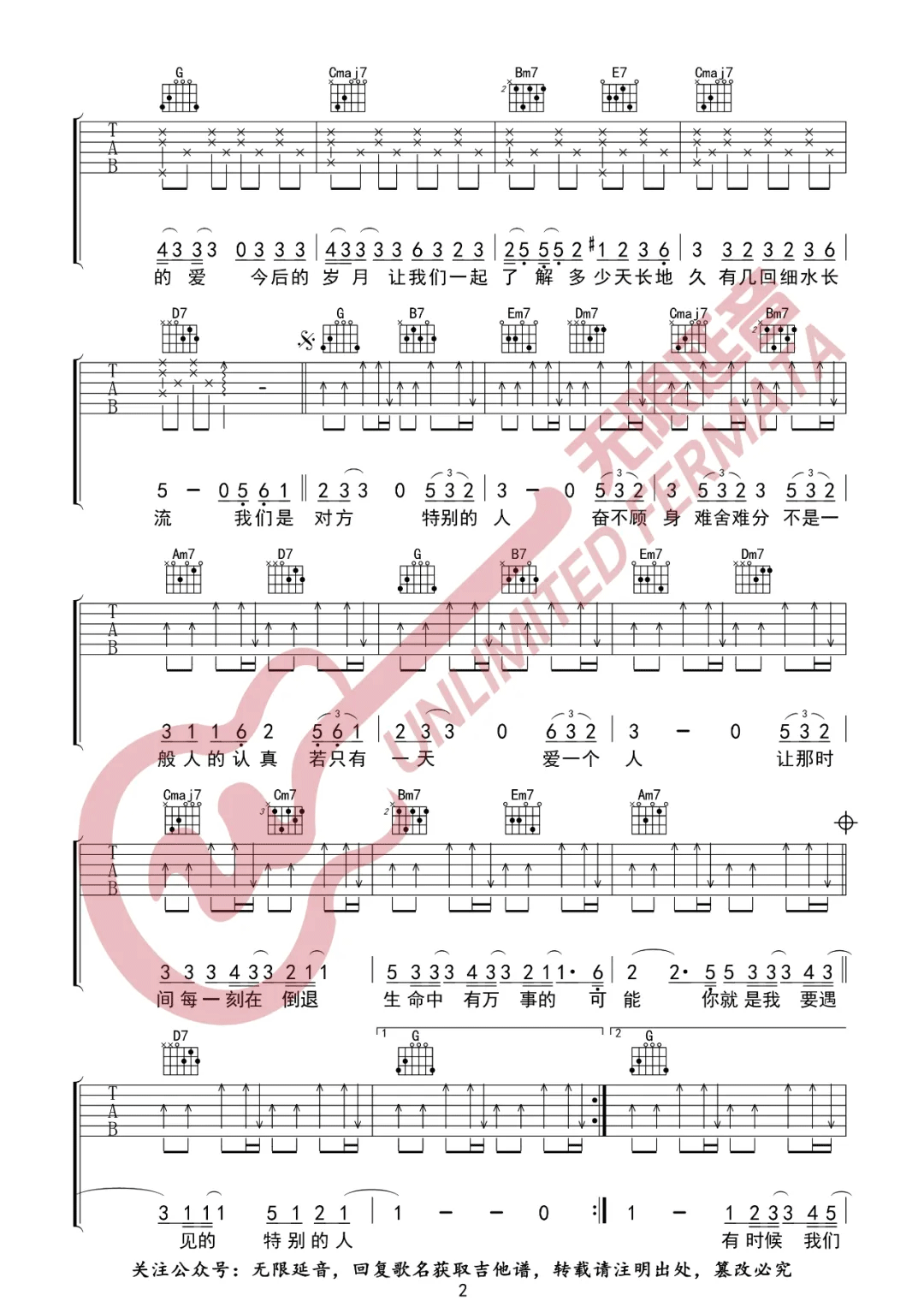 曲谱介绍: 方大同《特别的人》吉他弹唱谱,采用G调指法编配,共有3张高清图谱。