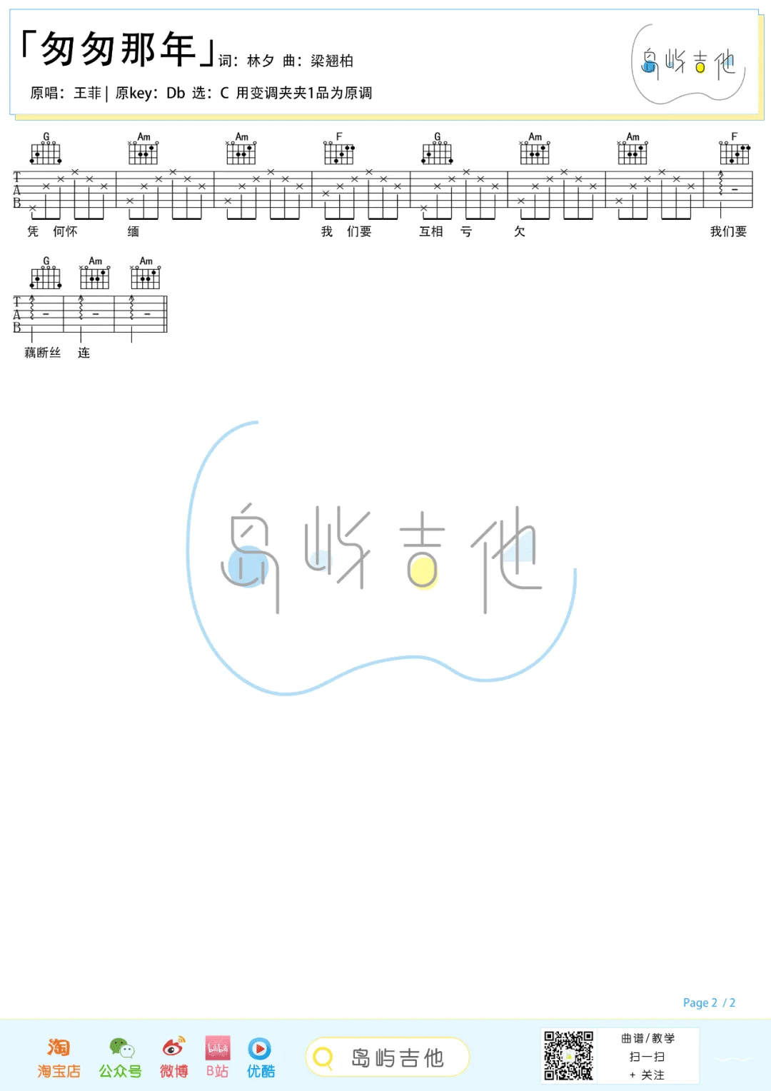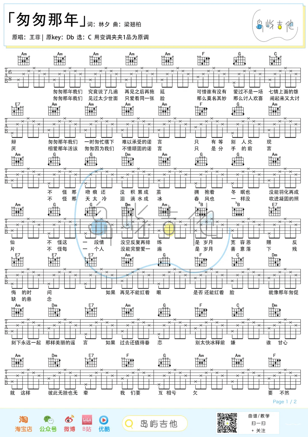曲谱介绍: 王菲《匆匆那年》吉他弹唱谱,采用C调指法编配,共有3张高清图谱。