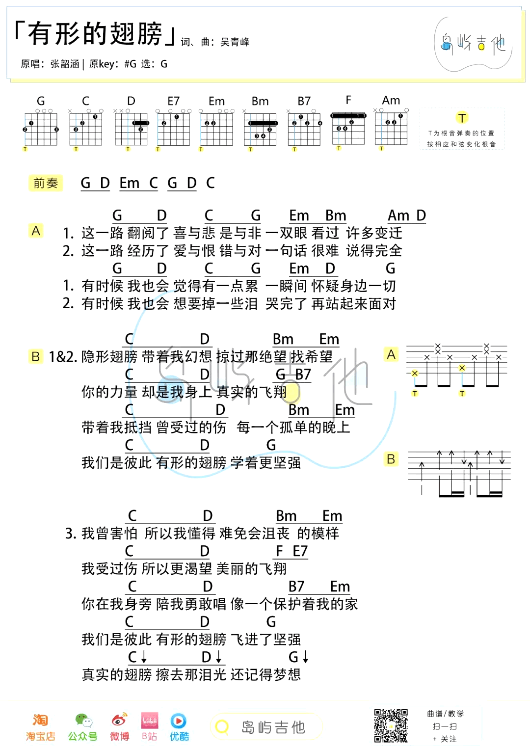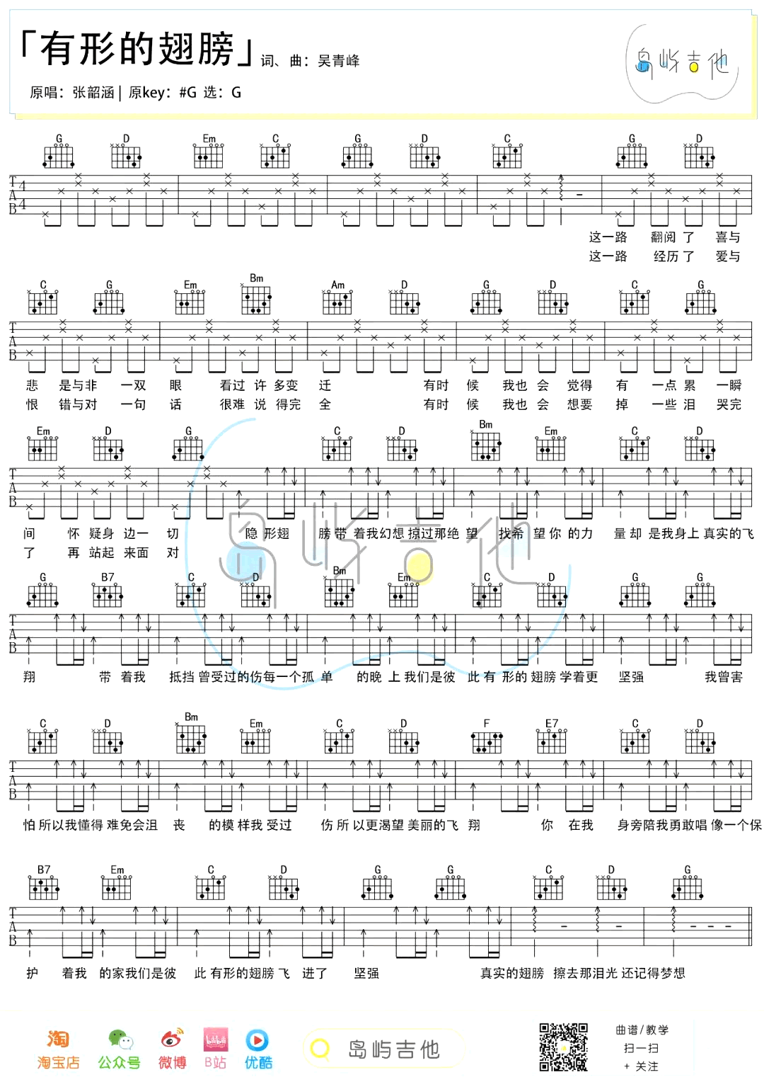 曲谱介绍: 张韶涵《有形的翅膀》吉他弹唱谱,采用G调指法编配,共有2张高清图谱,免翻页排版设计。