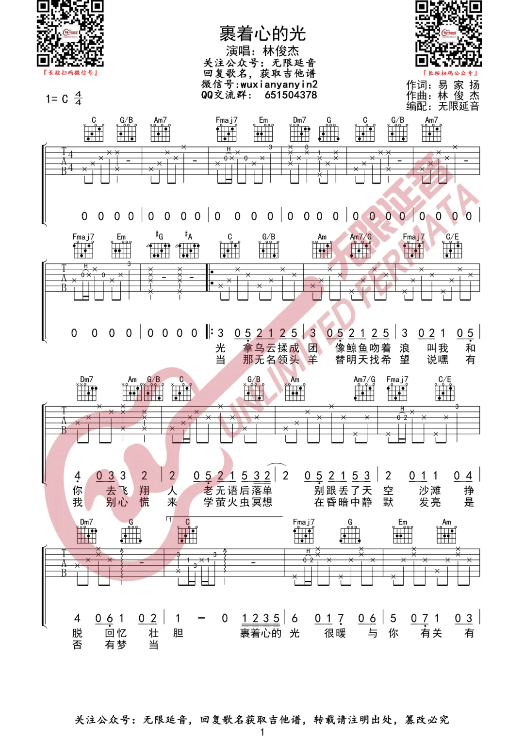 曲谱介绍: 林俊杰《裹着心的光》吉他弹唱谱,采用C调指法编配,共有3张高清图谱。