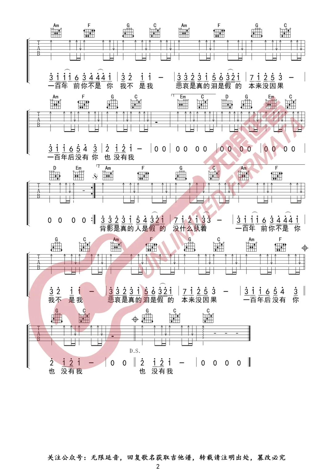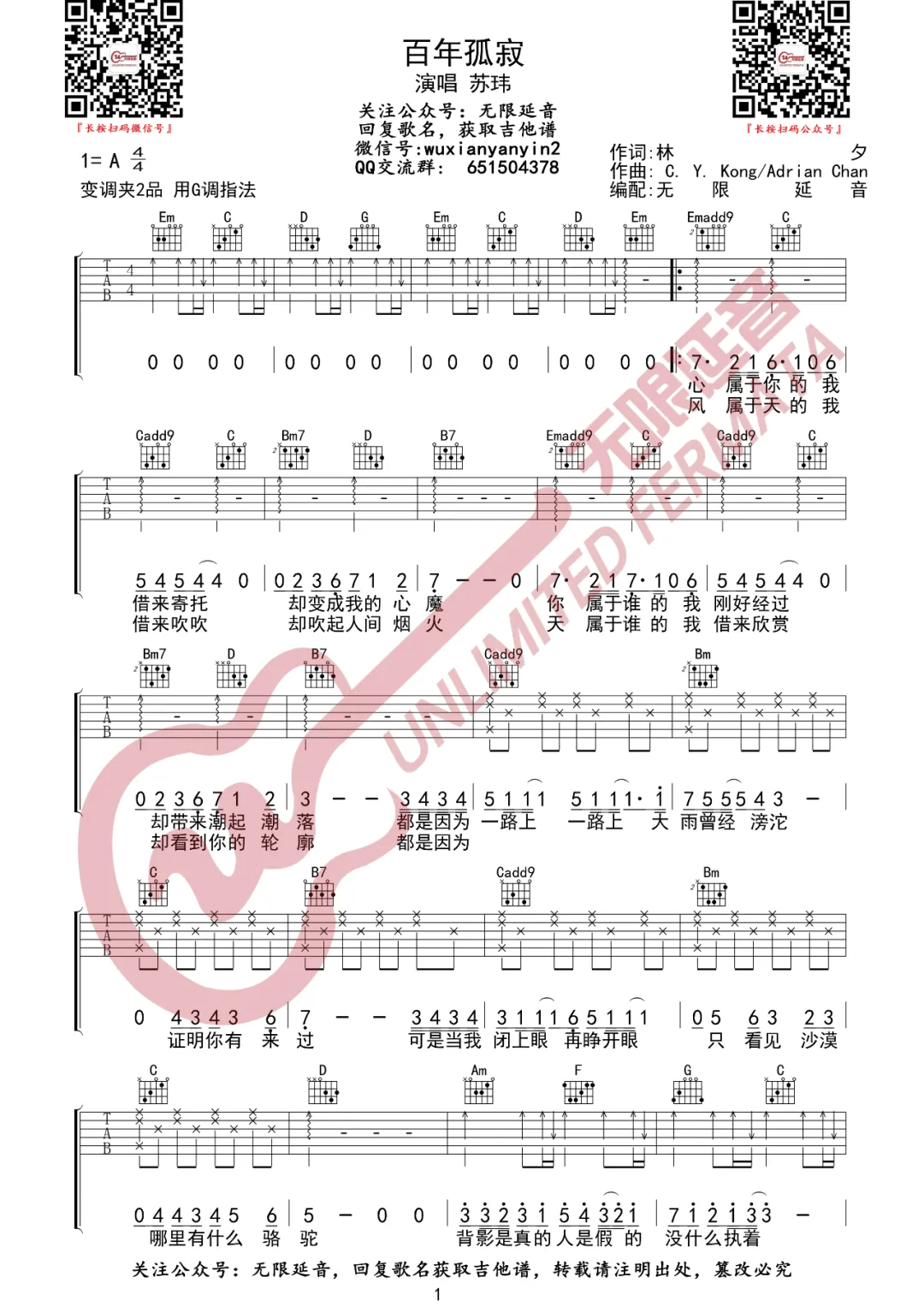 曲谱介绍: 苏玮《百年孤寂》吉他弹唱谱,采用G调指法编配,共有2张高清图谱,免翻页排版设计。
