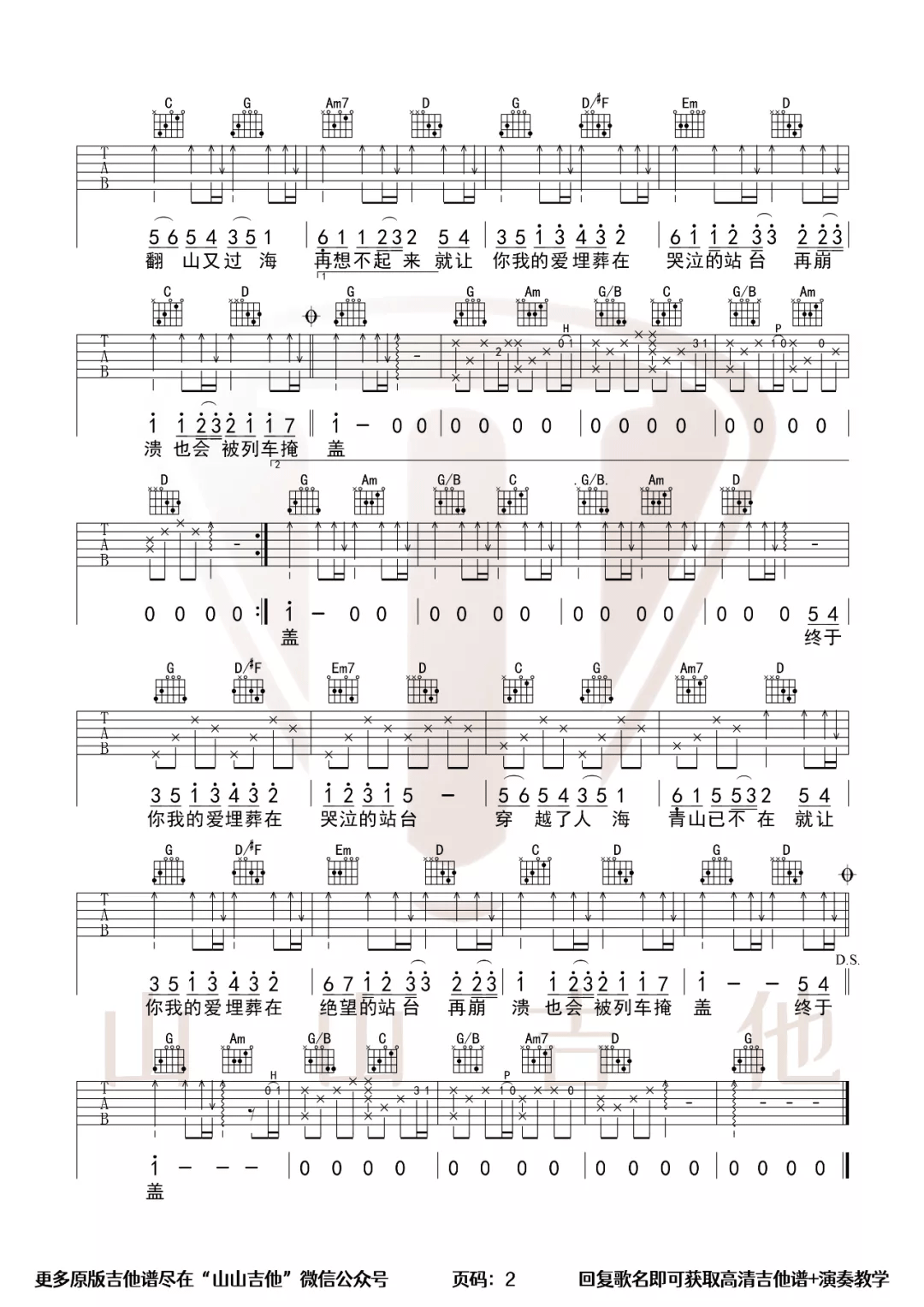 曲谱介绍: 王小帅《哭泣站台》吉他弹唱谱,采用G调指法编配,共有2张高清图谱,免翻页排版设计。