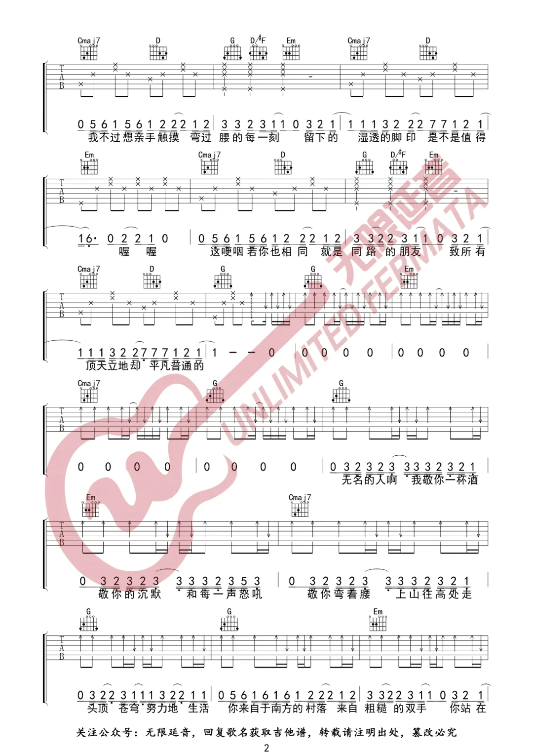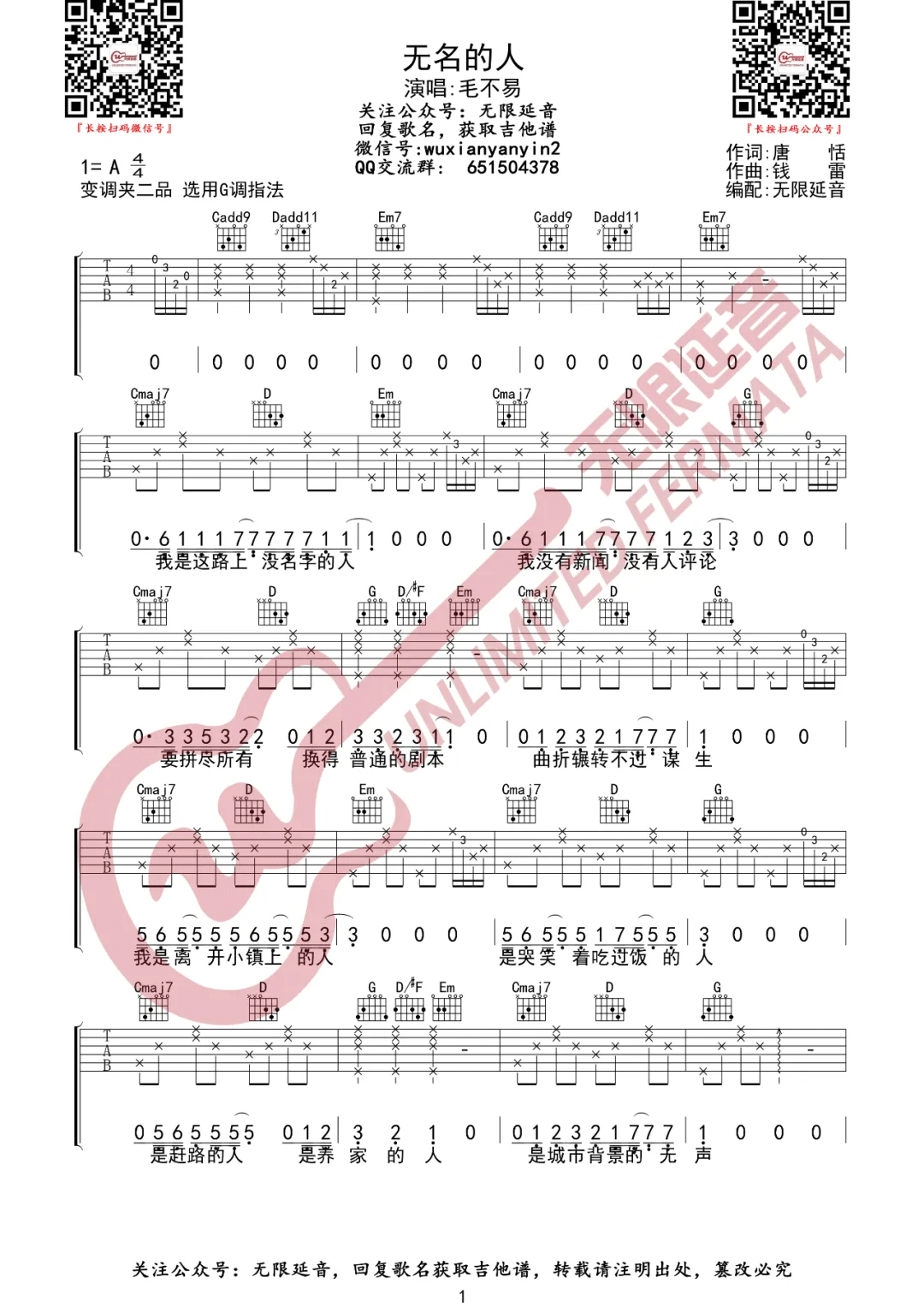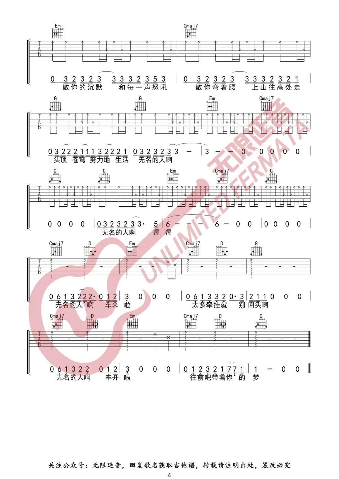 曲谱介绍: 毛不易《无名的人》吉他弹唱谱,采用G调指法编配原版,共有4张高清图谱。