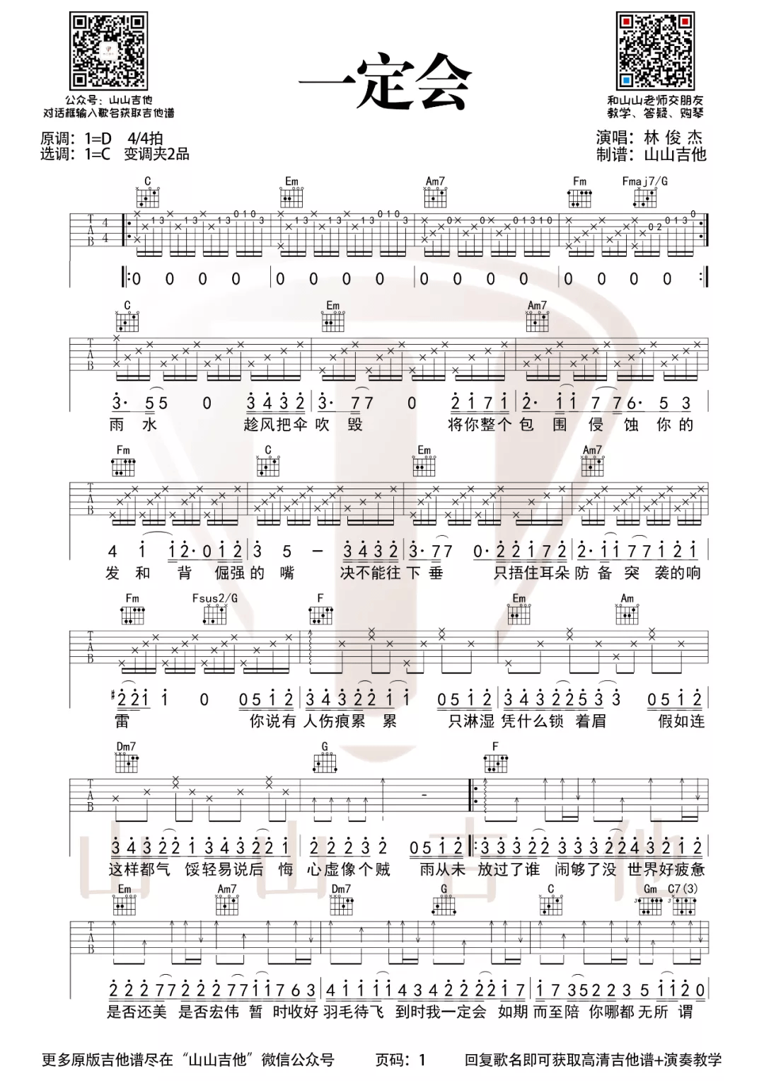 曲谱介绍: 林俊杰《一定会》吉他弹唱谱,采用C调指法编配,共有2张高清图谱,免翻页排版设计。