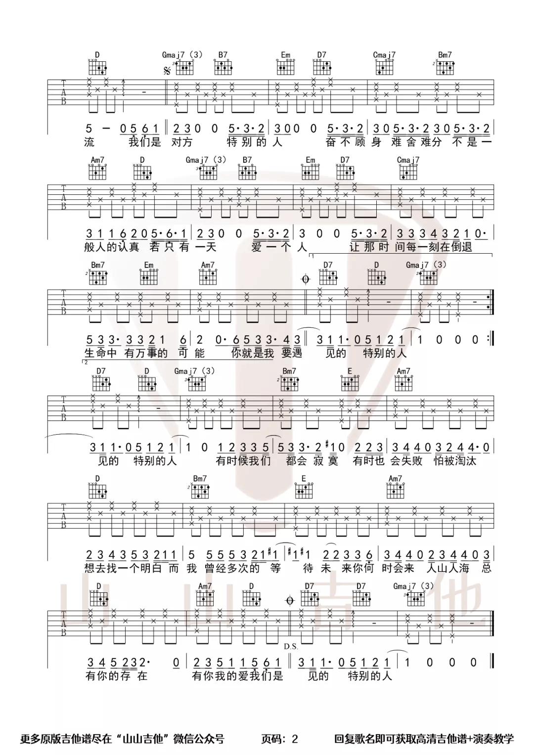 曲谱介绍: 方大同《特别的人》吉他弹唱谱,采用G调指法编配,共有2张高清图谱,免翻页排版设计。