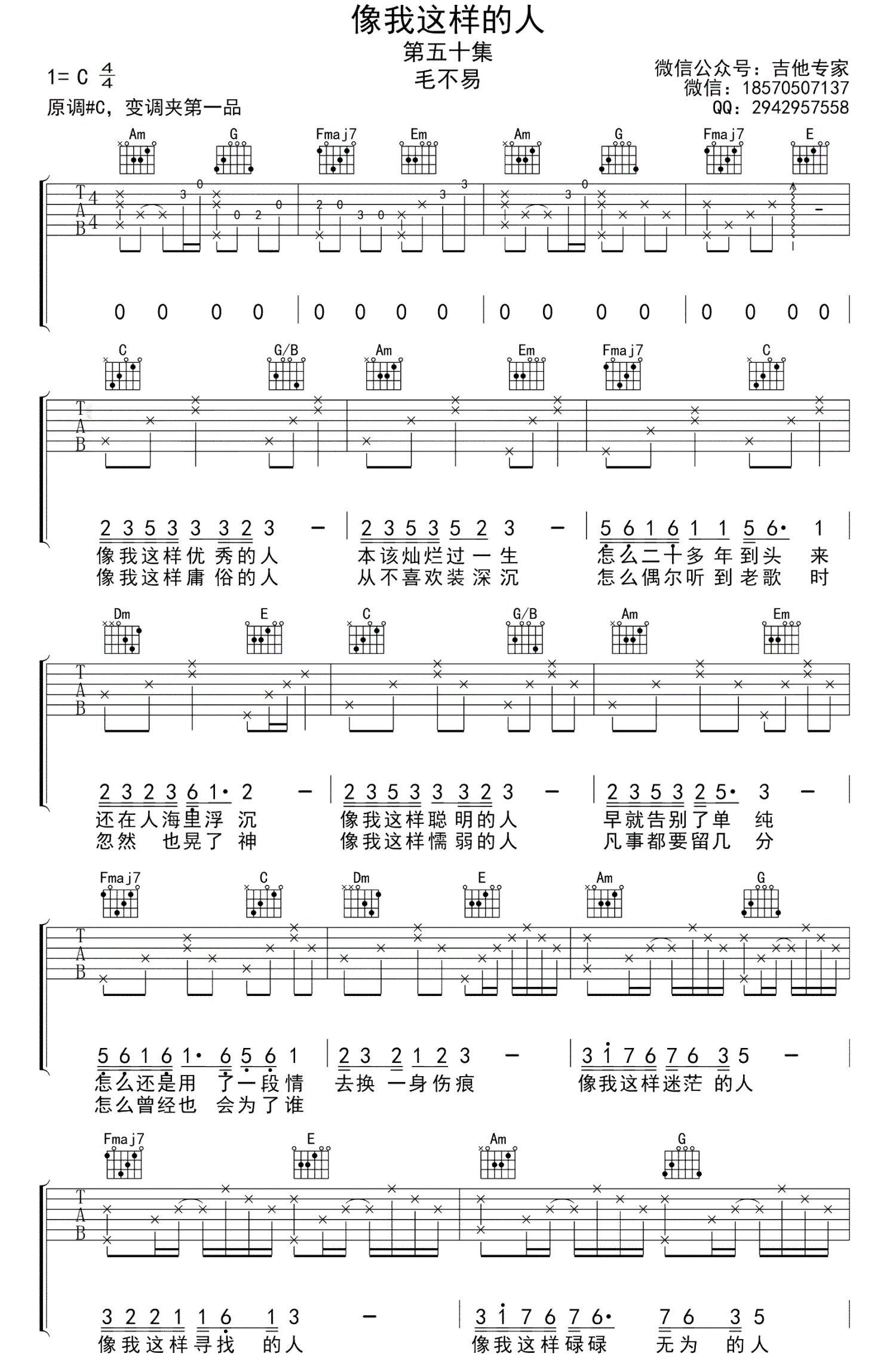 曲谱介绍: 毛不易《像我这样的人》吉他谱,原调#C,变调夹夹第二品,选用C调指法,原版弹唱谱编配。《明日之子》节目毛不易的原创作品,编者按:《像我这样的人》呼声很高哦!这首歌曲原本是键盘伴奏的,老师特意改编成了吉他版,也不是很难,所以就没有再出简单版的谱子了。毛不易的确很赞!特别喜欢他的歌词!