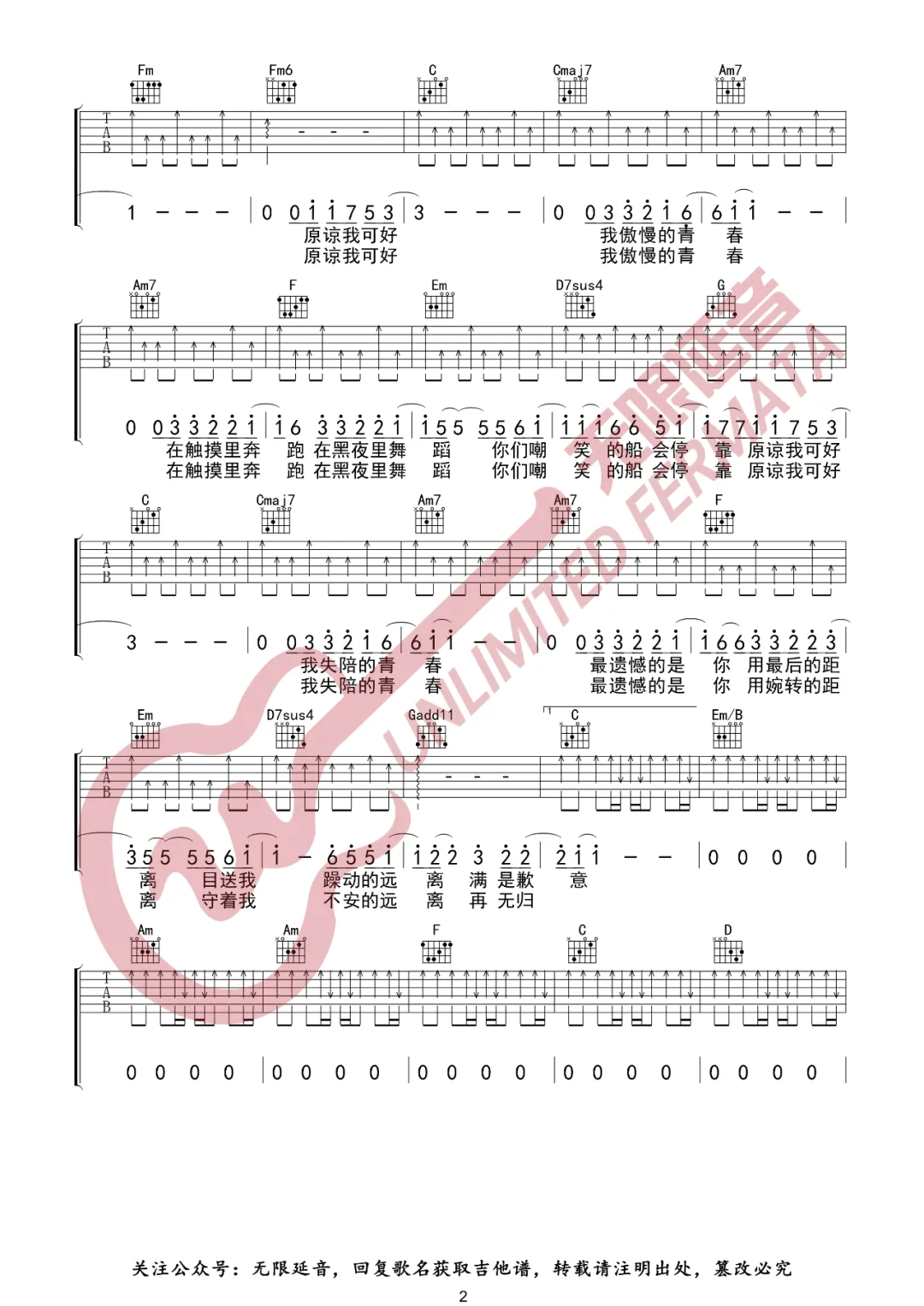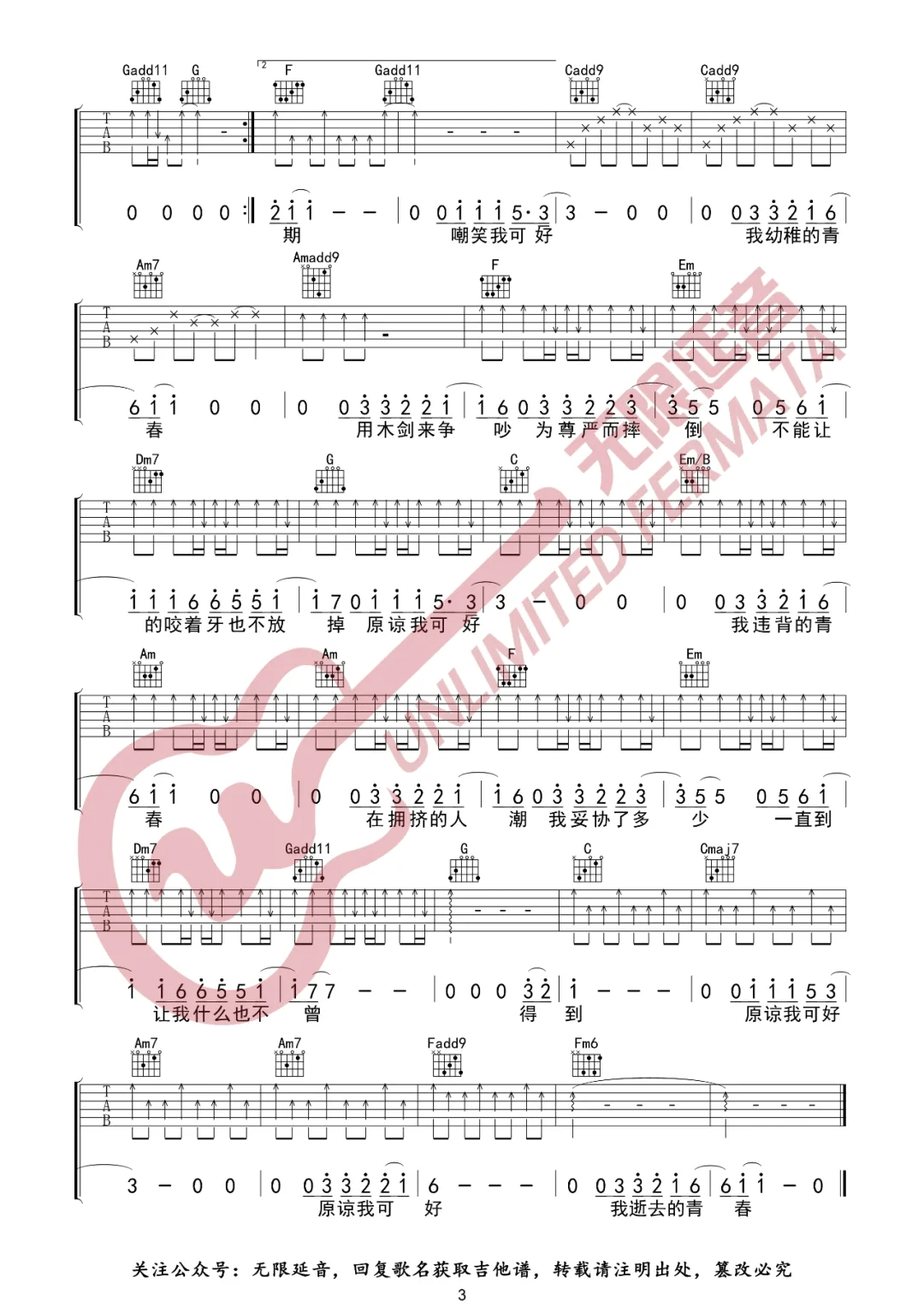 曲谱介绍: 薛之谦《违背的青春》吉他弹唱谱,采用C调指法编配,共有3张高清图谱。