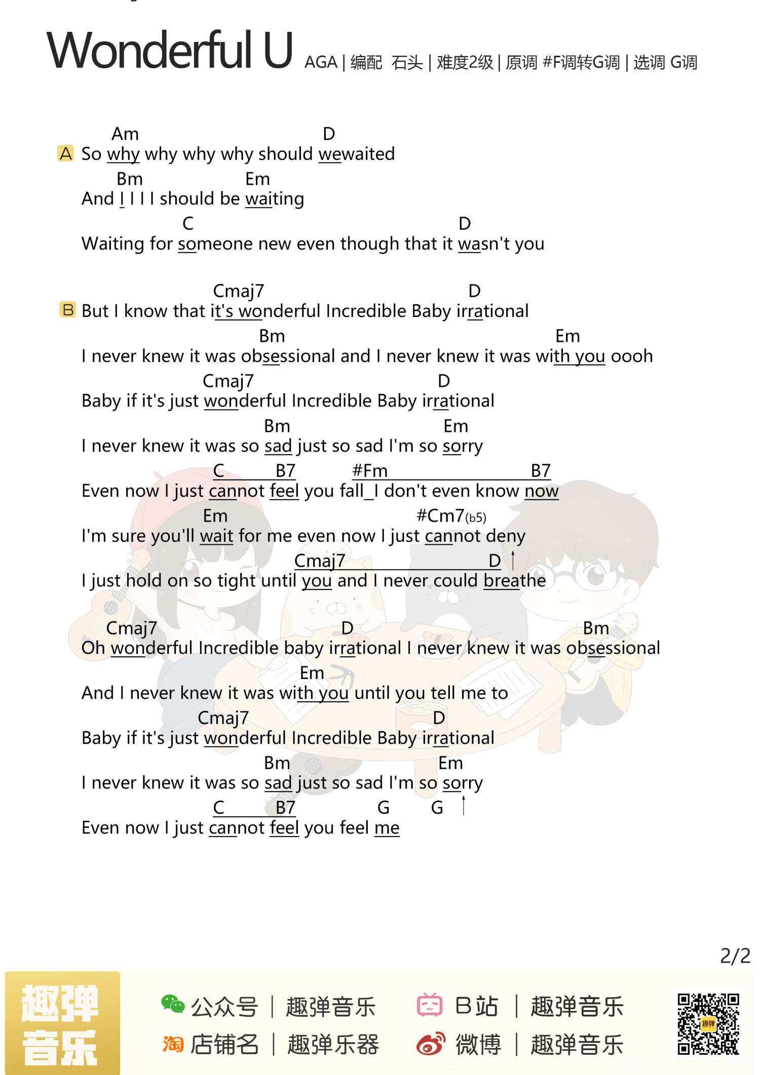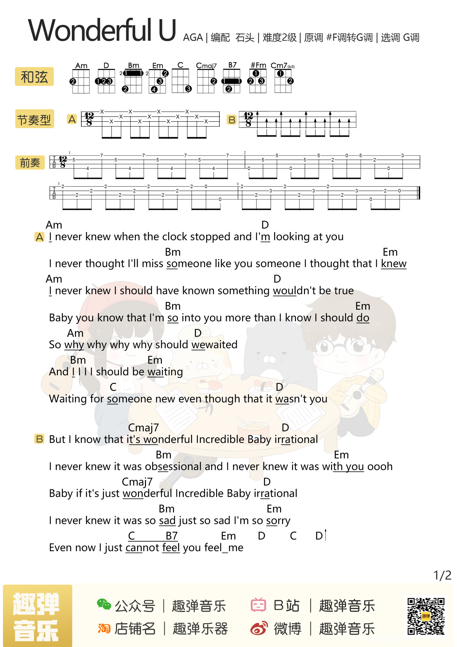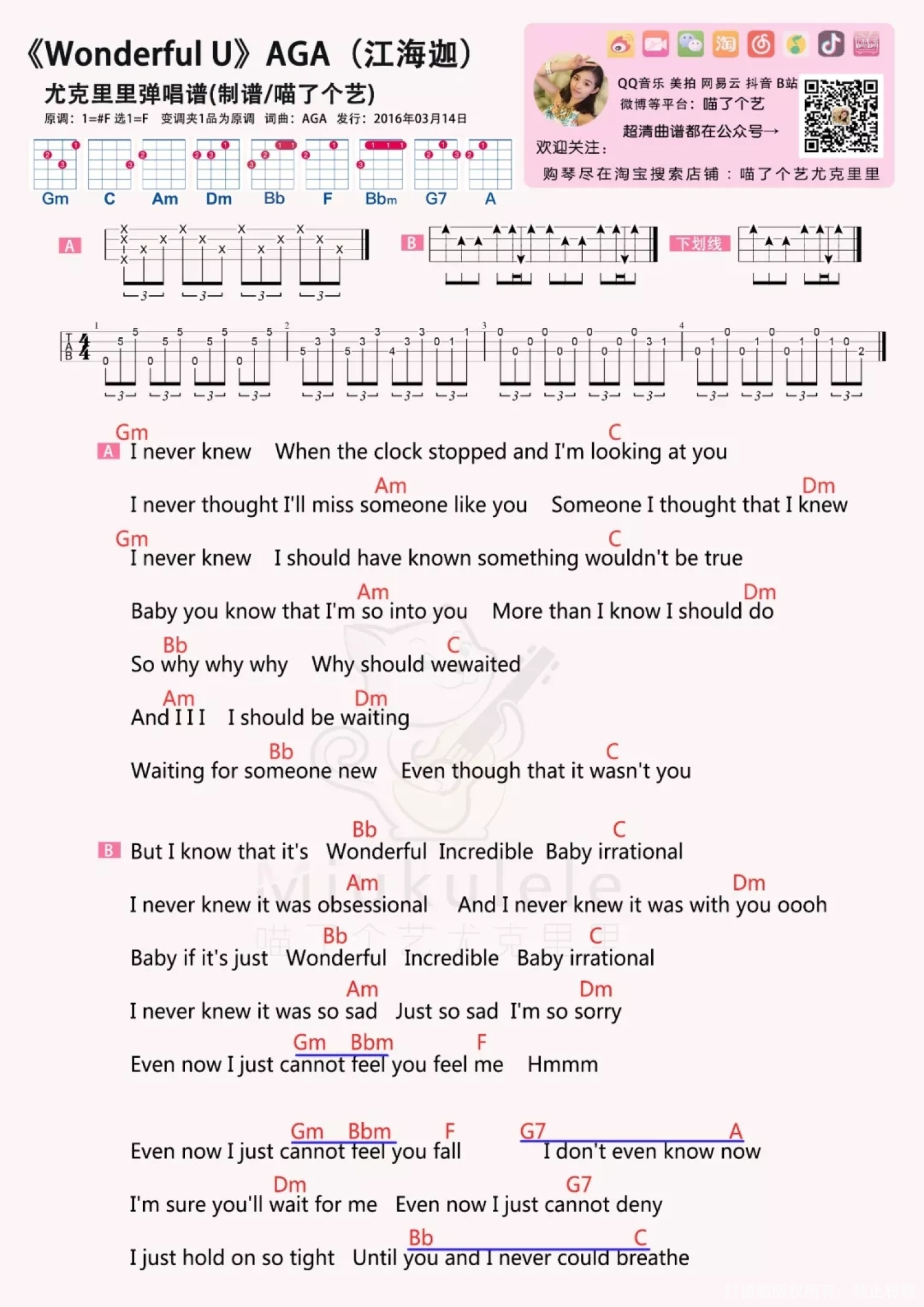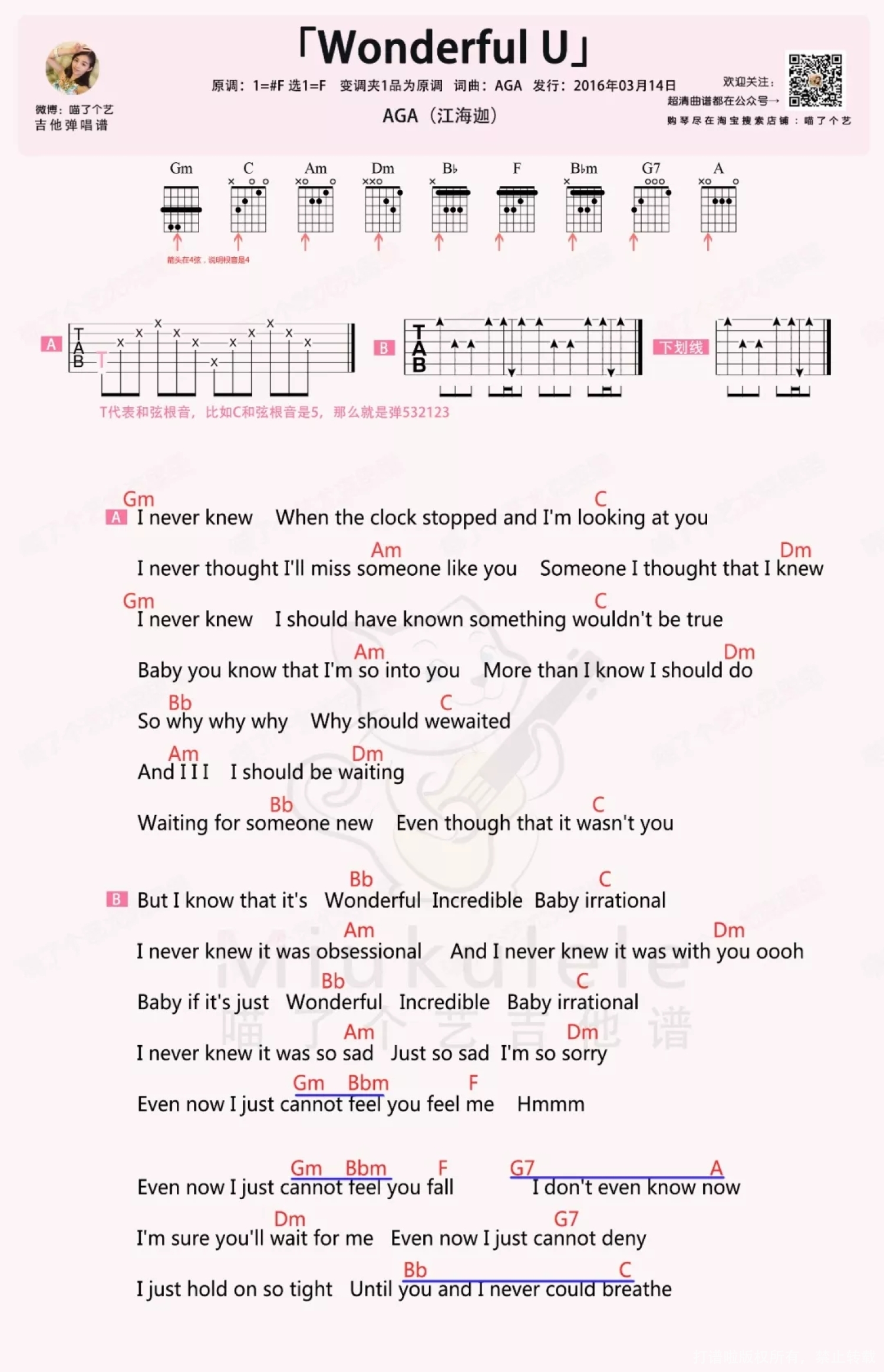 曲谱介绍: 趣弹版: 如果要我安利一首 光靠旋律就爱上的歌 一定是这首《Wonderful U》 钢琴前奏搭配清澈的女声 一下子就抓住了我的耳朵! 这是一首有点悲伤的小情歌 说的是一个女生暗恋一个男生的故事 来自香港女歌手江海迦 这首歌经常被作为视频背景音乐 光是前奏响起 就会有很多人问是什么歌~ 《Wonderful U》尤克里里弹唱谱   喵了个艺版: 1、尤克里里谱   2、《Wonderful U》吉他谱