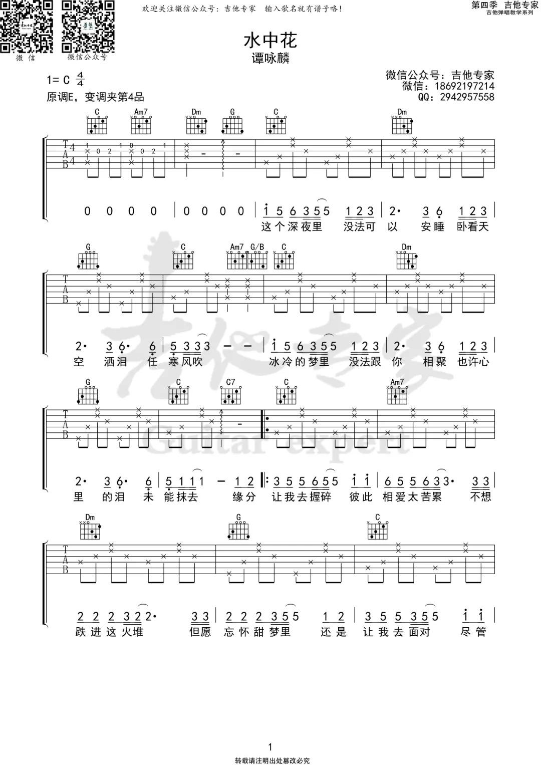 曲谱介绍: 谭咏麟《水中花》吉他弹唱谱,采用C调指法编配,共有3张高清图谱。