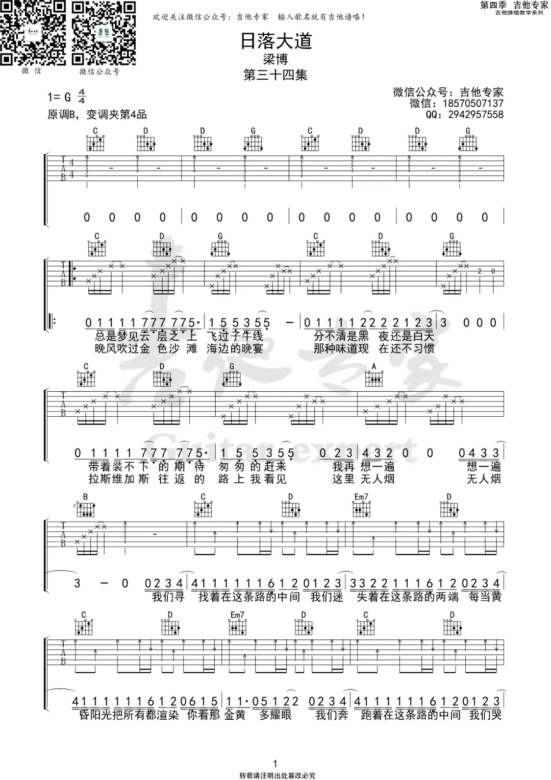 日落大道吉他谱 - 梁博 - G调吉他弹唱谱