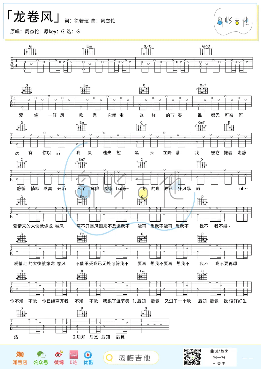 曲谱介绍: 周杰伦/五月天《龙卷风》吉他弹唱谱,采用G调指法编配,共有2张高清图谱,免翻页排版设计。