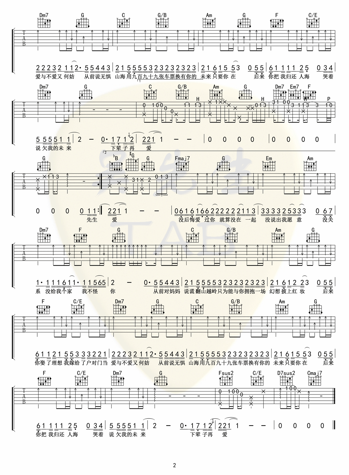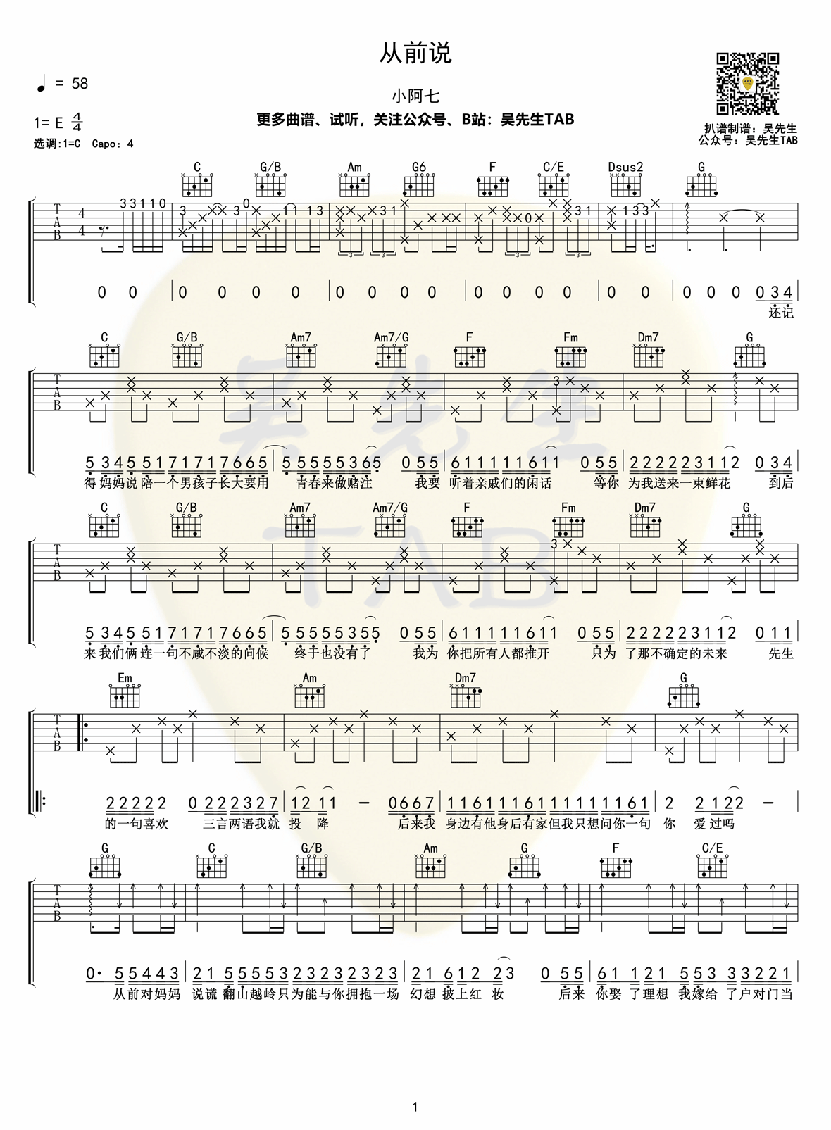 曲谱介绍: 小阿七《从前说》吉他弹唱谱,采用C调指法编配原版,共有2张高清图谱,免翻页排版设计。