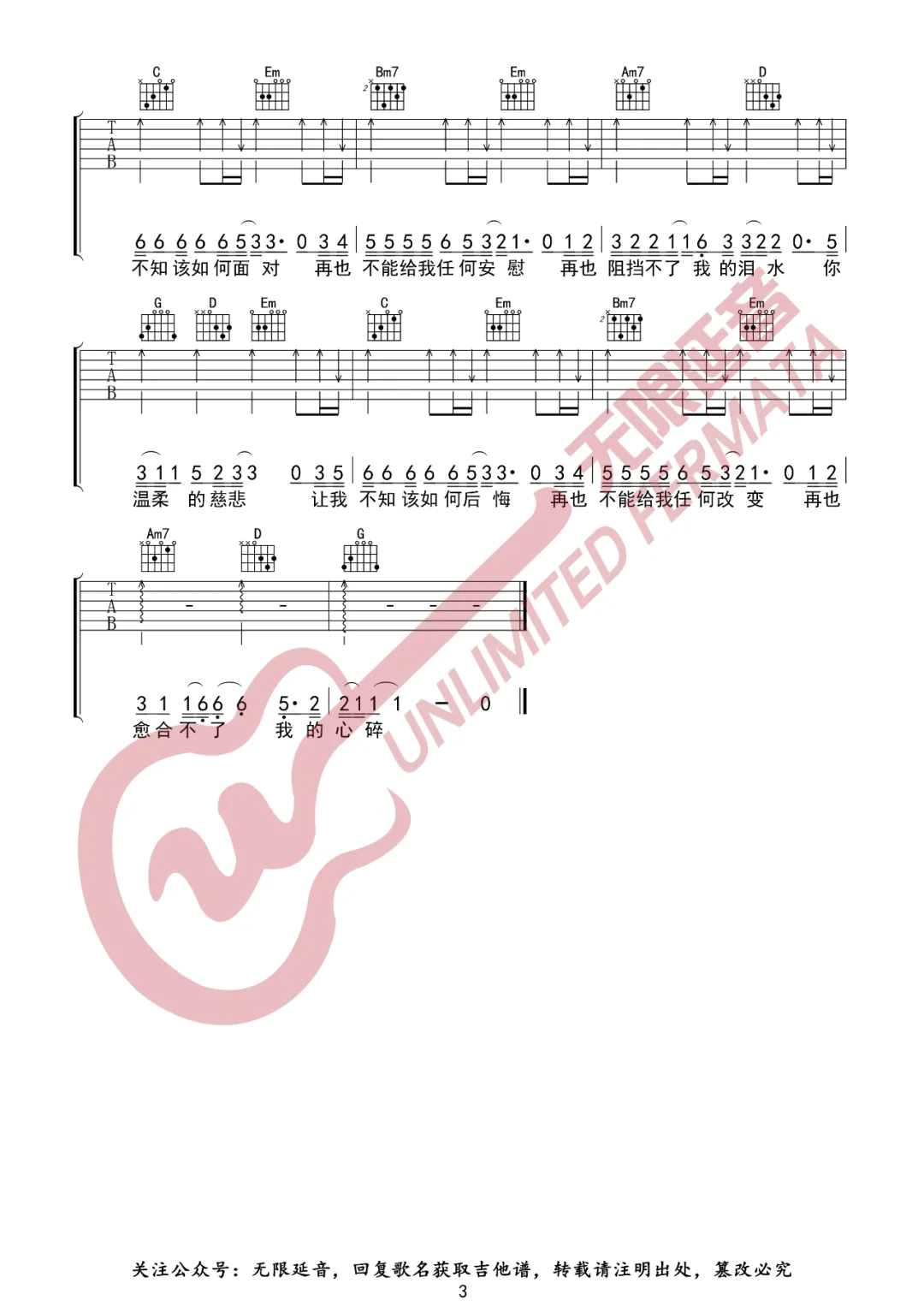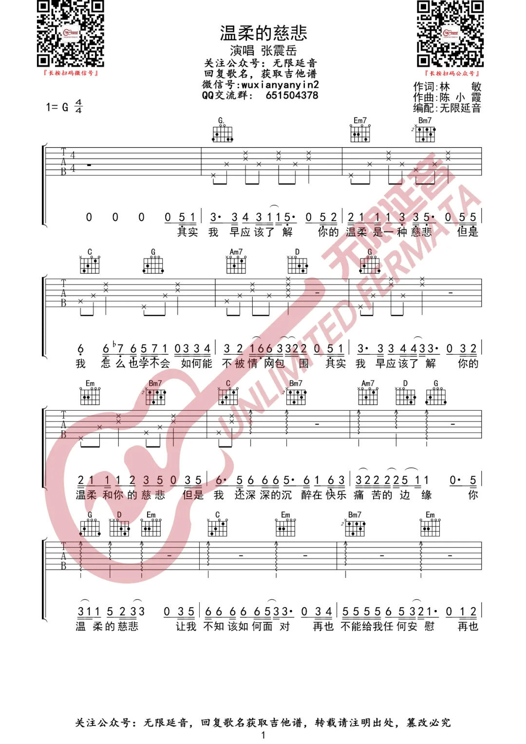 曲谱介绍: 张震岳《温柔的慈悲》吉他弹唱谱,采用G调指法编配,共有3张高清图谱。