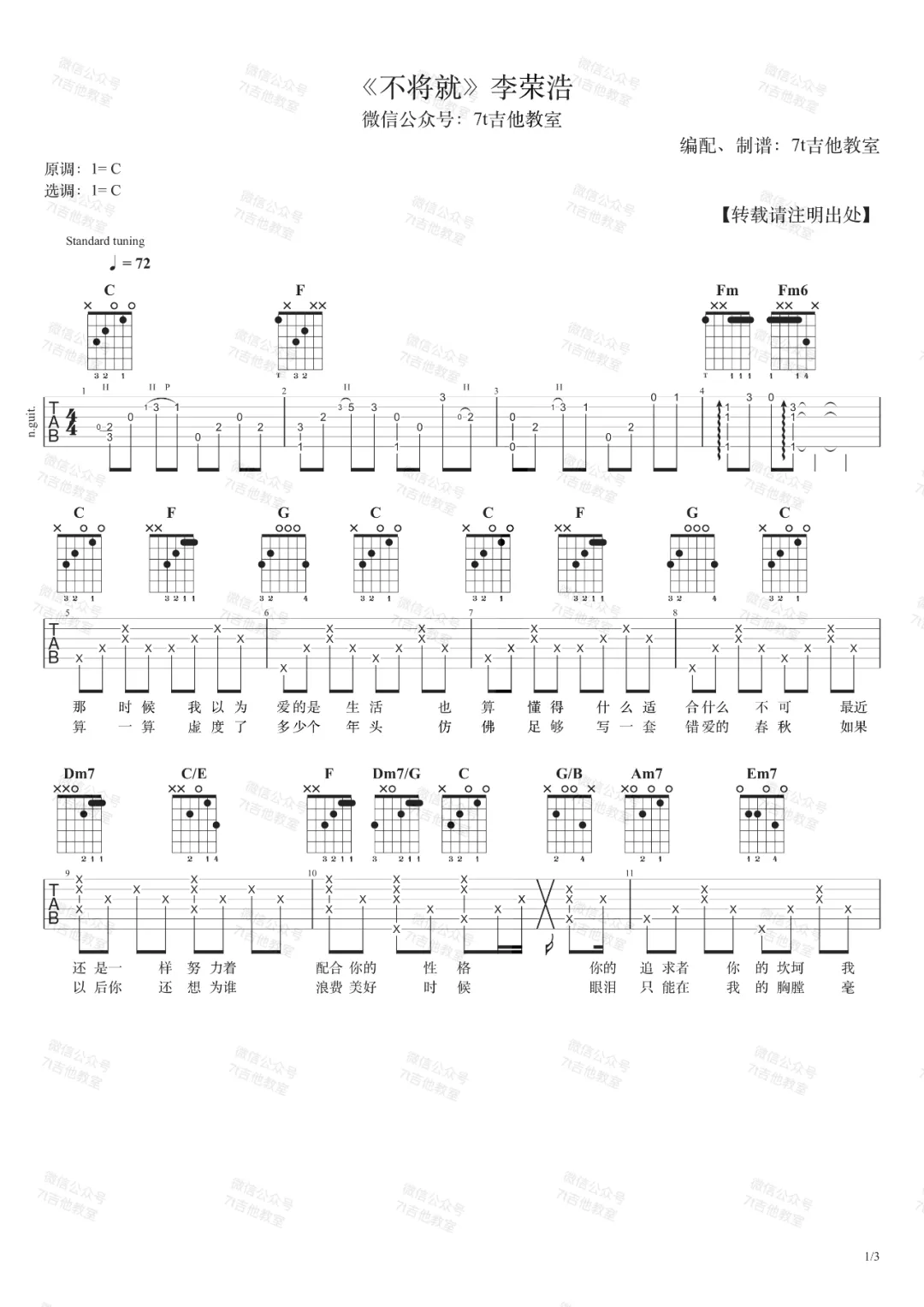 曲谱介绍: 李荣浩《不将就》吉他弹唱谱,采用C调指法编配原版,共有3张高清图谱。