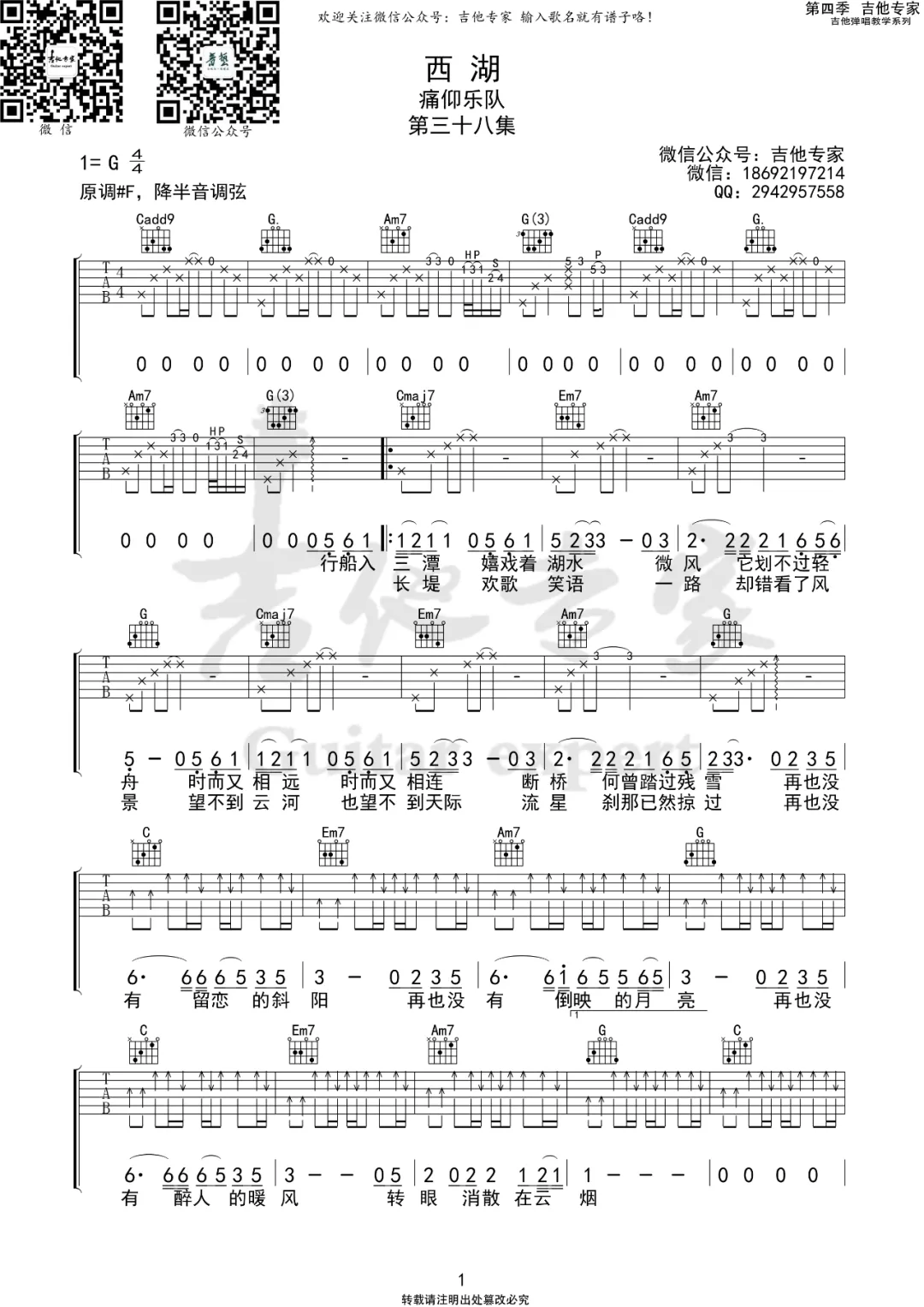 曲谱介绍: 痛仰乐队《西湖》吉他弹唱谱,采用G调指法编配,共有2张高清图谱,免翻页排版设计。