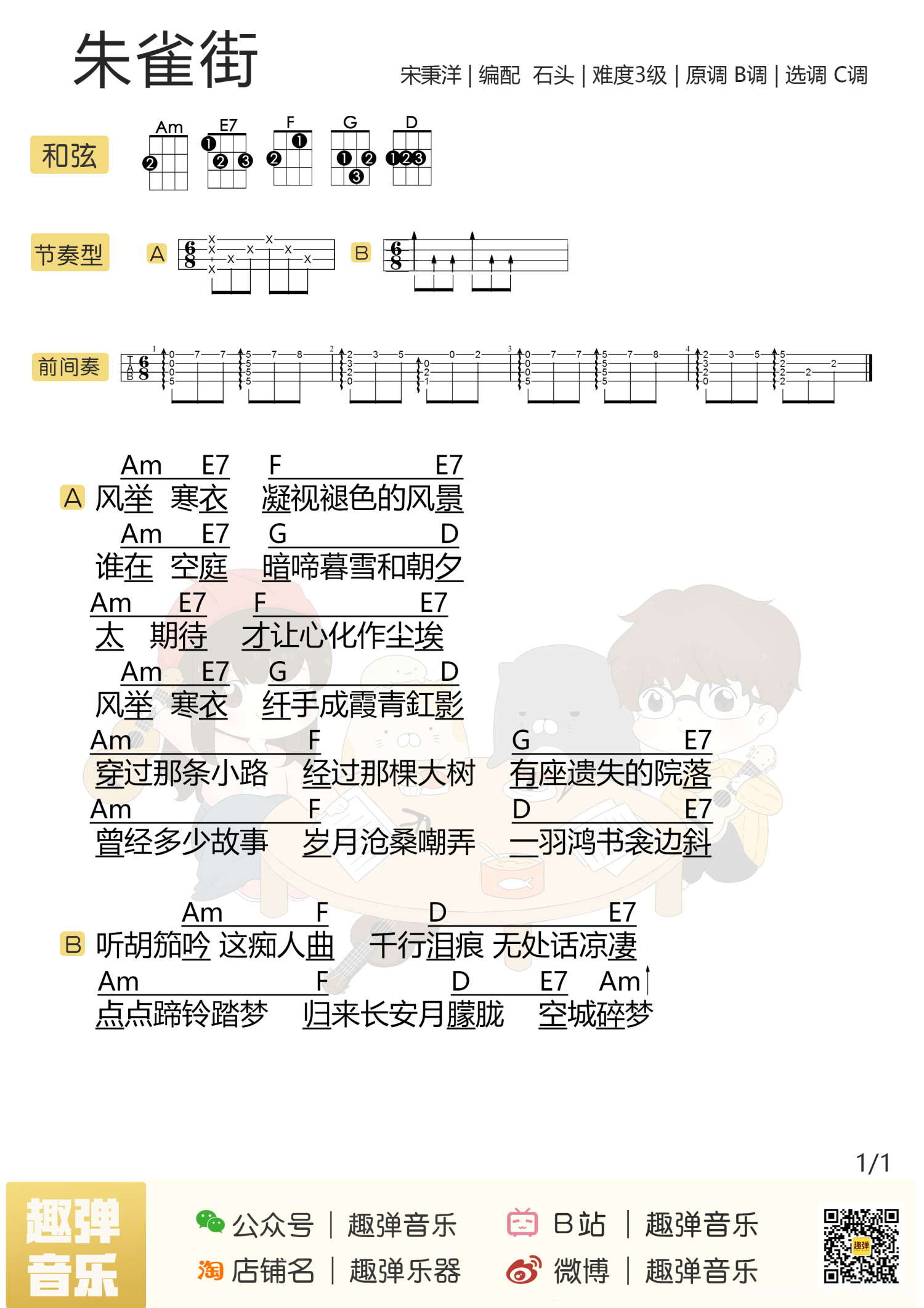 曲谱介绍: 《朱雀街》尤克里里弹唱谱 今天安利一首炒鸡好听的「朱雀街」 这首歌由宋秉洋创作 是网剧《结爱》的插曲 忧伤的旋律和悠扬的声线 唱出了男主千古的爱恋和思念