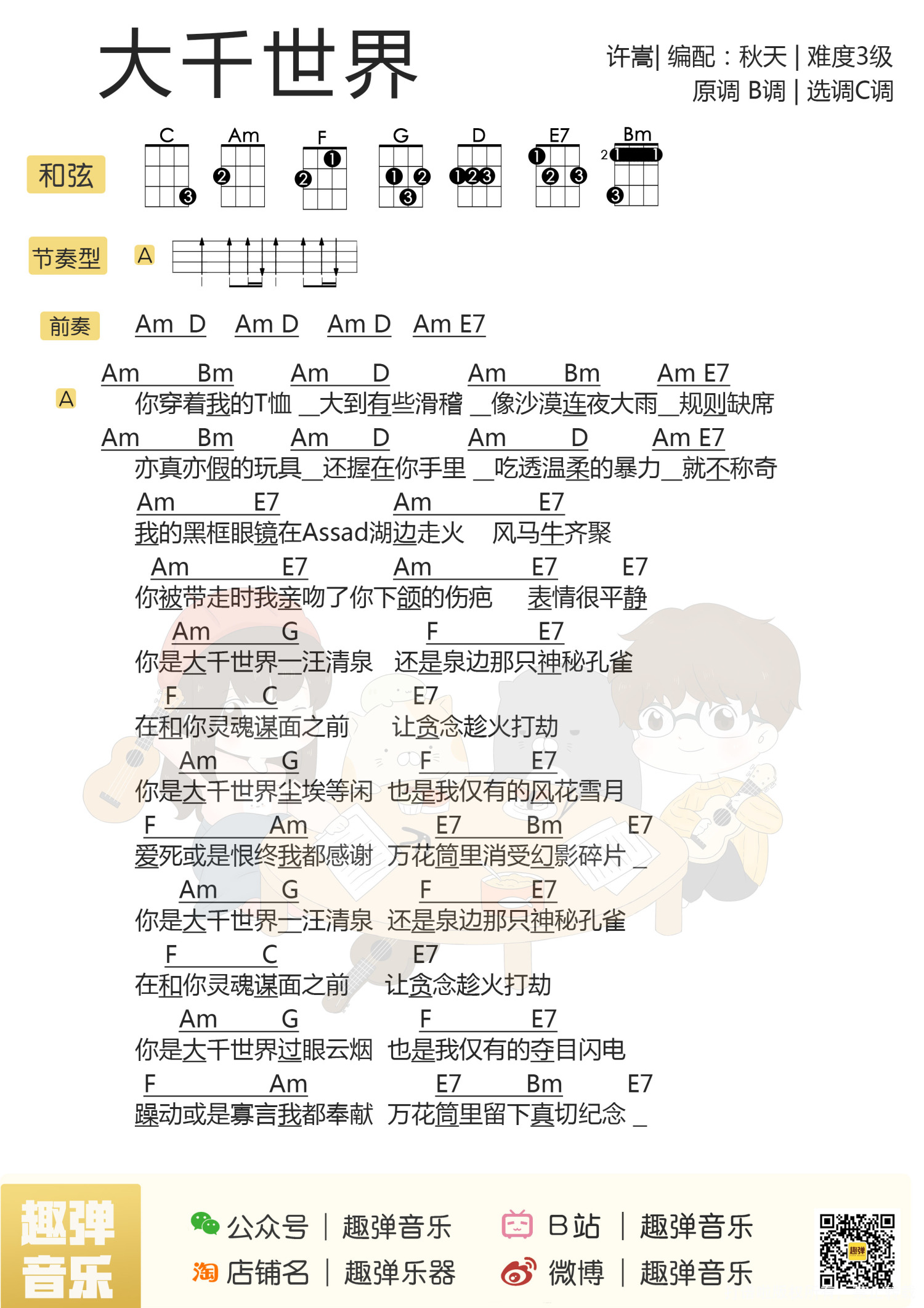 曲谱介绍: 《大千世界》尤克里里弹唱谱 啦啦啦~啦啦啦~我是制谱的小行家 Aloha,制谱委员会又和大家见面啦 最近被许嵩的新歌「大千世界」圈粉 迫不及待的要分享给大伙~ 这首歌与许嵩一贯的风格有所不同 歌词和旋律听起来十分“魔性” 音乐制作的手法也相当新锐 几句人工颤音听一次就上瘾了