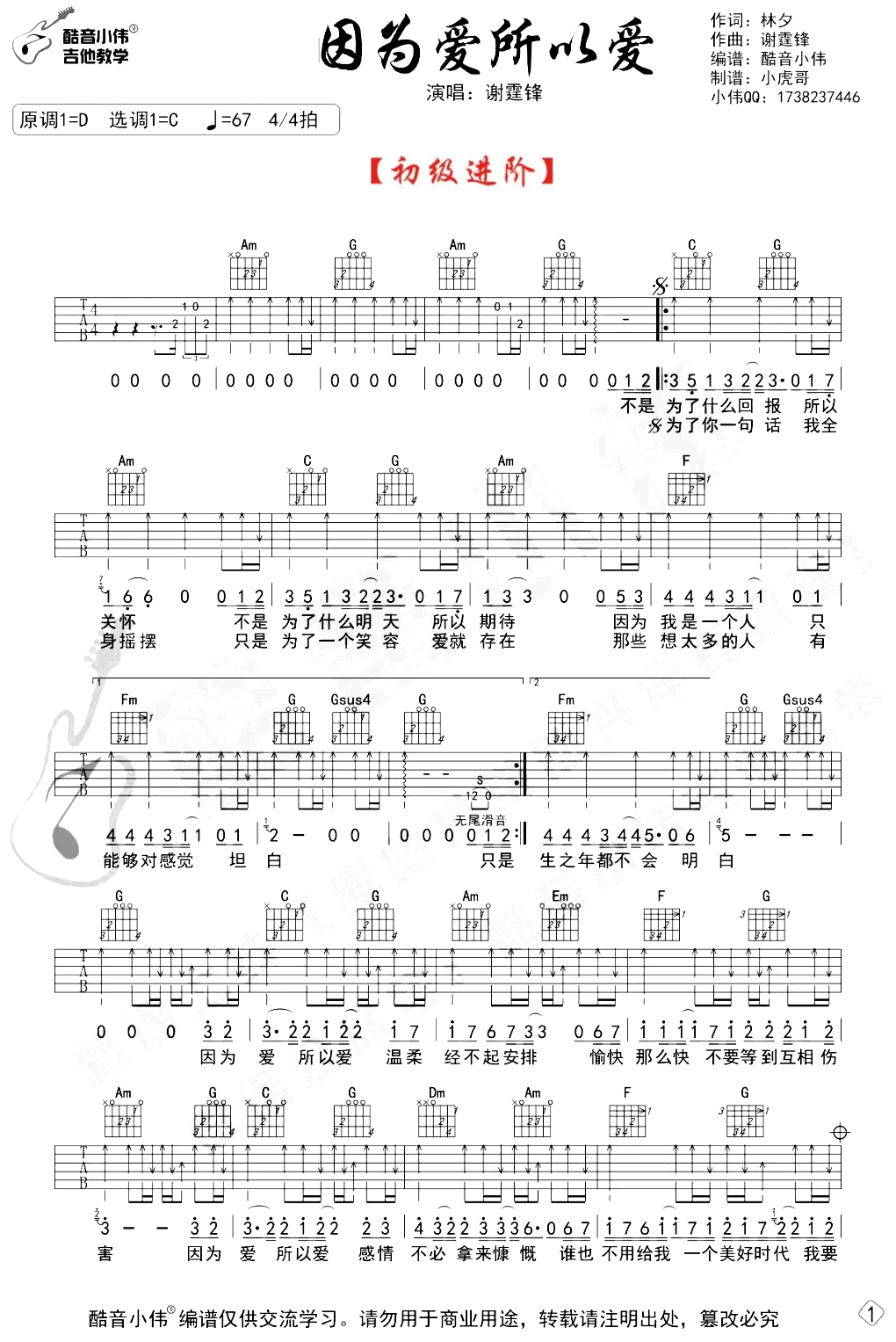 曲谱介绍: 因为爱所以爱吉他谱,原调D选调C,四四拍,初级进阶版编配,谢霆锋的一首经典代表歌曲。随谱附上《因为爱所以爱》吉他弹唱教学视频。