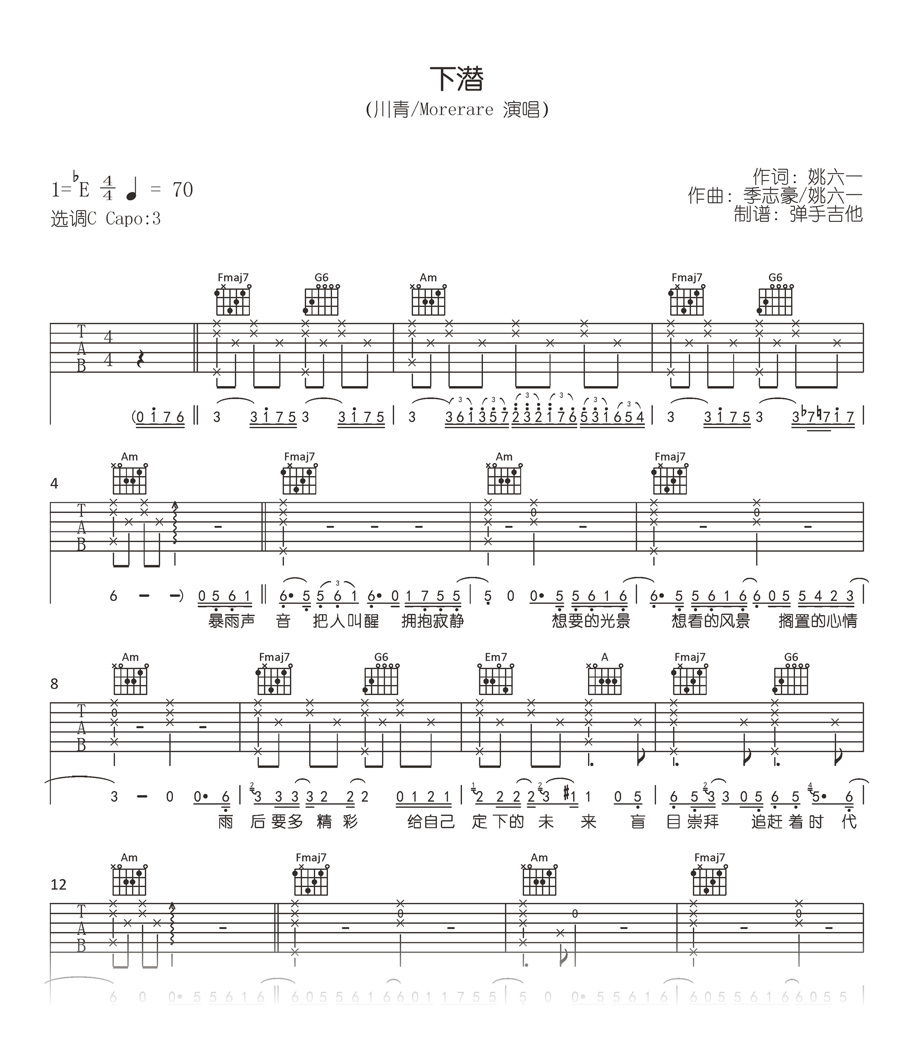 曲谱介绍: 川青/Mororare翻唱的一首网络热门歌曲,悲伤又深刻却又能鼓舞人心。下潜吉他谱,原调bE,选调C,Capo夹三品,《下潜》吉他弹唱谱,完整编配共三张高清图片六线谱。