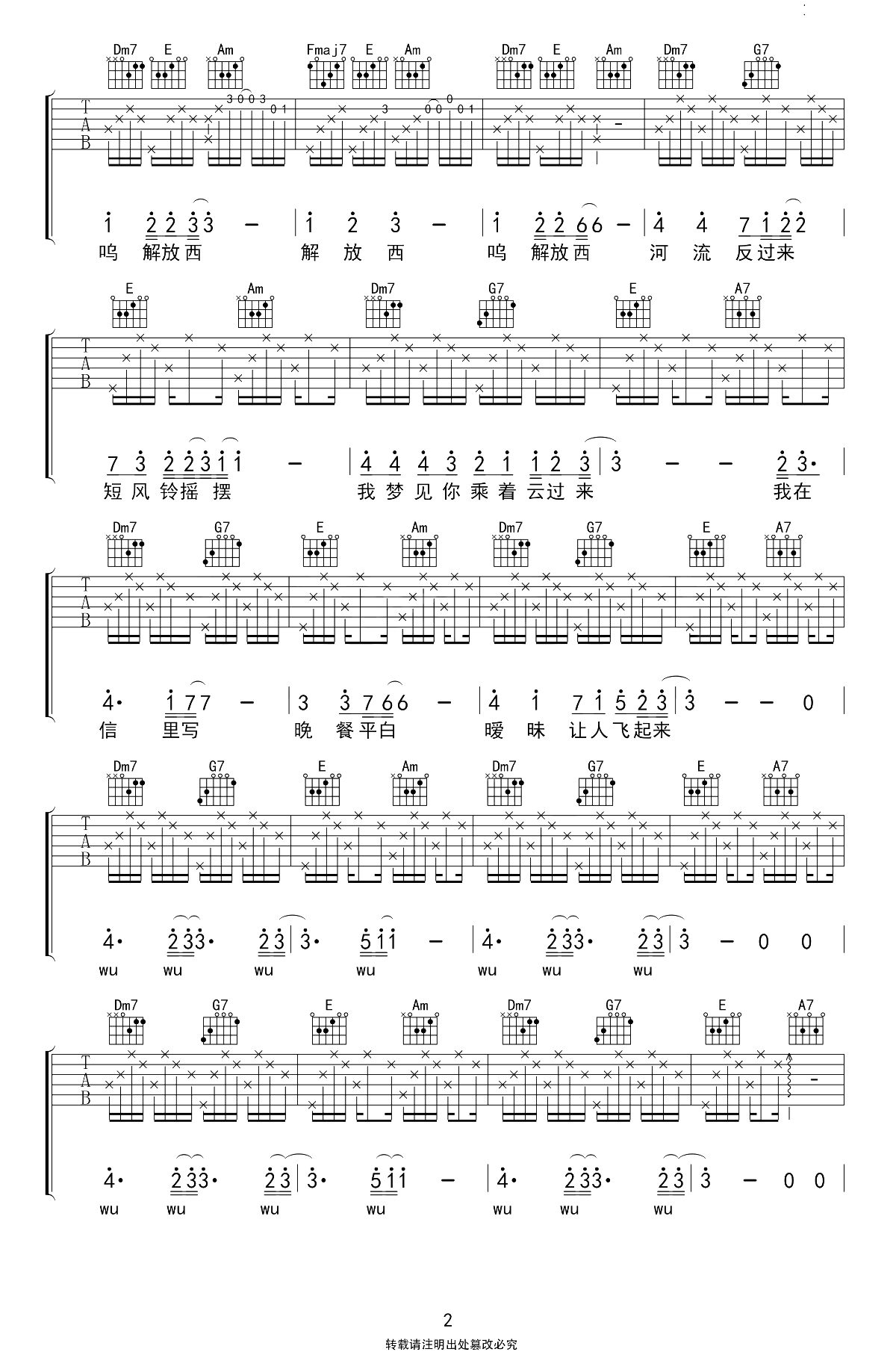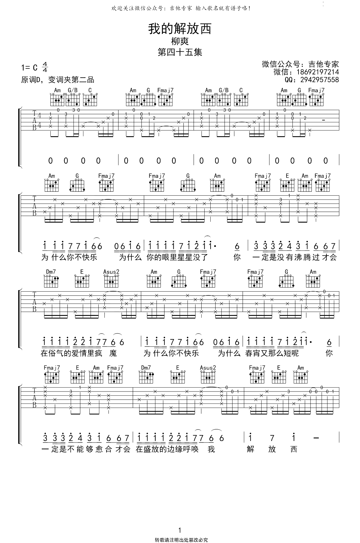 曲谱介绍: 柳爽演唱,我的解放西吉他谱,这首歌曲基本上按照原版编配的,有个超长尾奏,喜欢的小伙伴可以好好练练!《我的解放西》吉他弹唱谱,原调D,选用C调指法,变调夹夹第二品,三张图片六线谱。