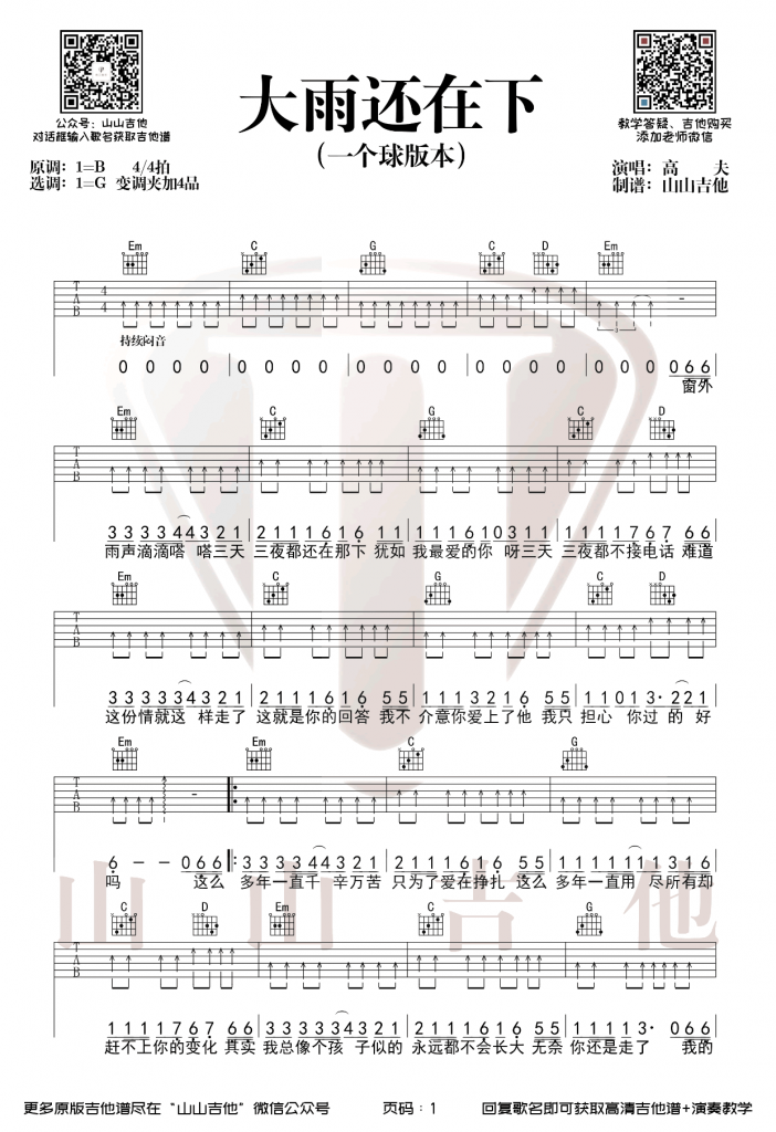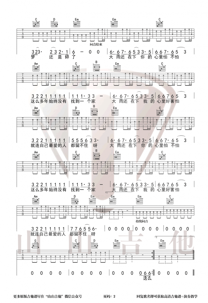 曲谱介绍: 吉他弹唱演示《大雨还在下》吉他弹唱谱,共有2张高清图谱,免翻页排版设计。
