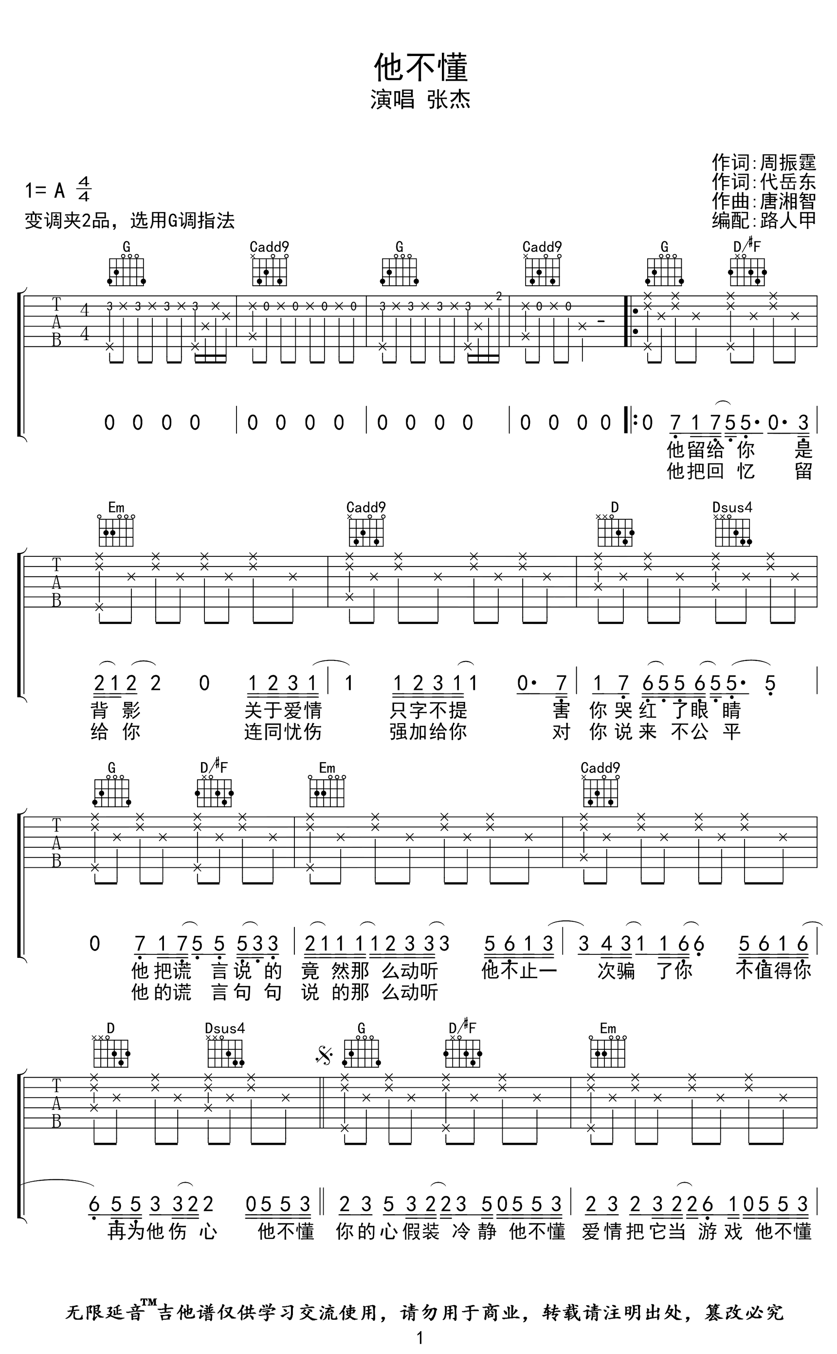他不懂吉他谱 - 张杰 - G调吉他弹唱谱