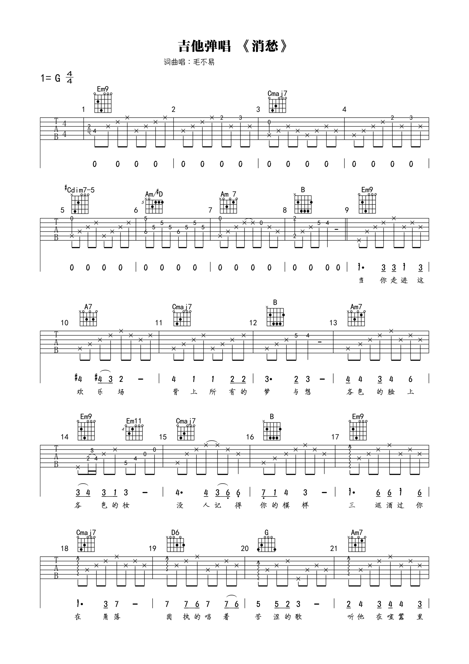 消愁吉他谱 - 毛不易 - G调吉他弹唱谱