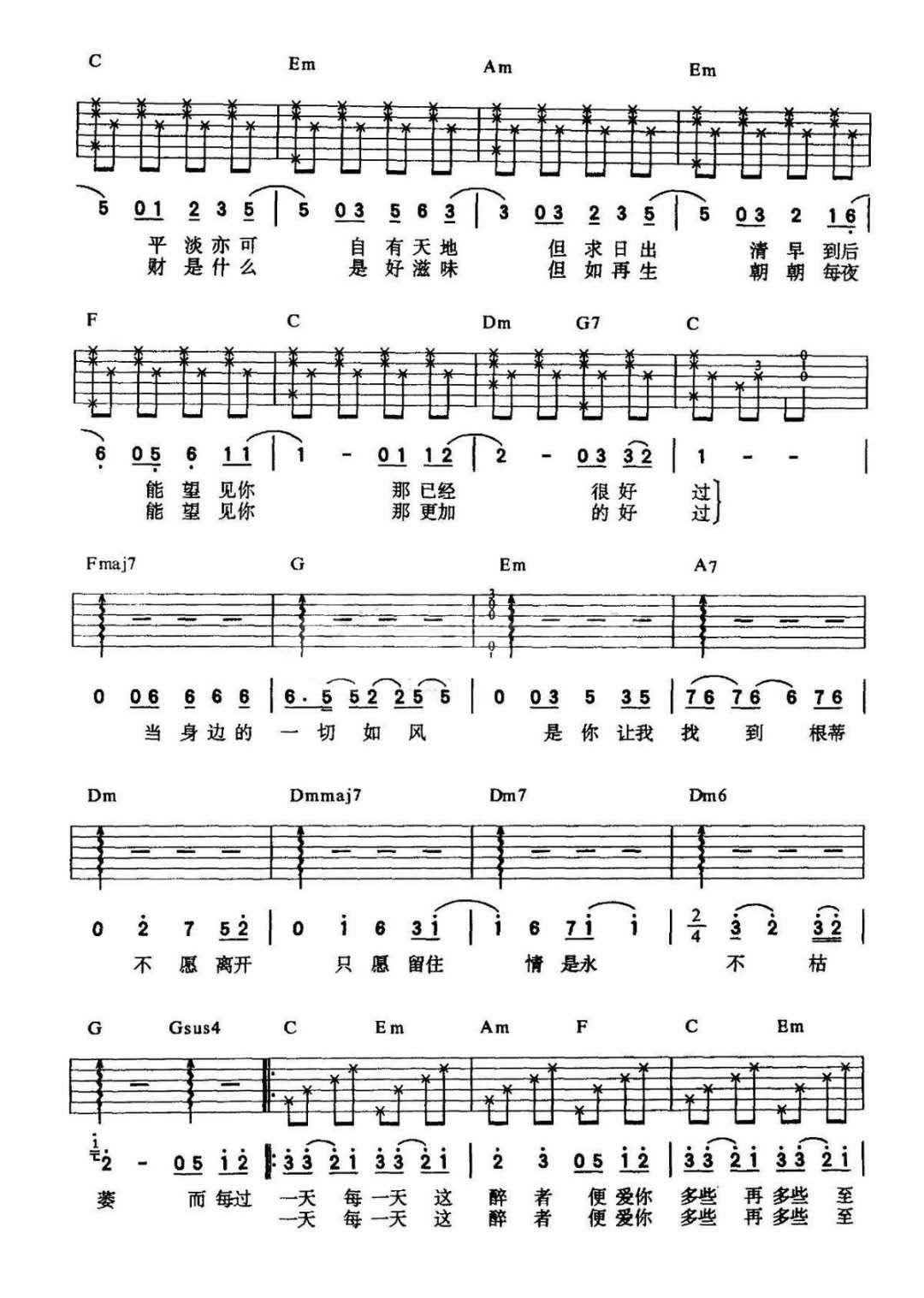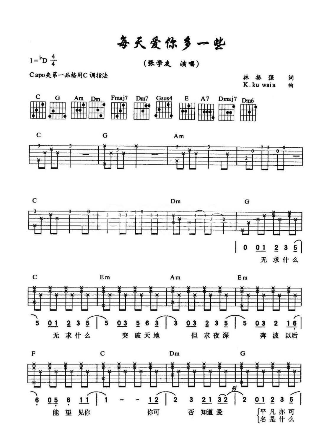 曲谱介绍: 张学友《每天爱你多一些》吉他弹唱谱,采用C调指法编配,共有3张高清图谱。