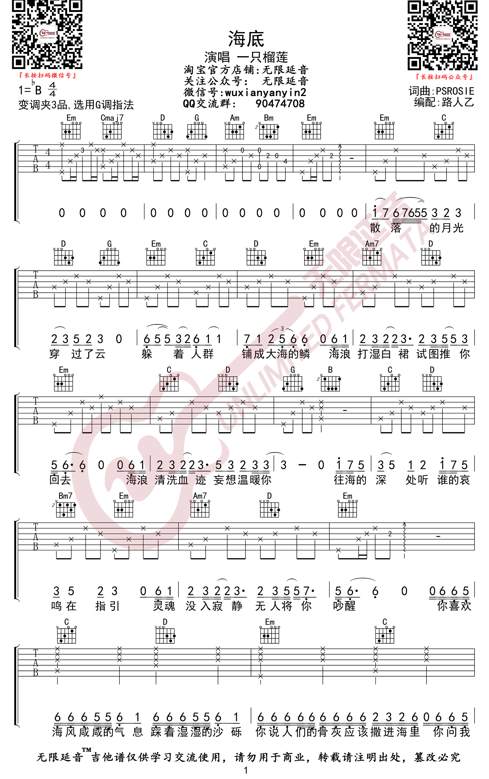 曲谱介绍: 一支榴莲《海底》吉他弹唱谱,采用G调指法编配,共有3张高清图谱。
