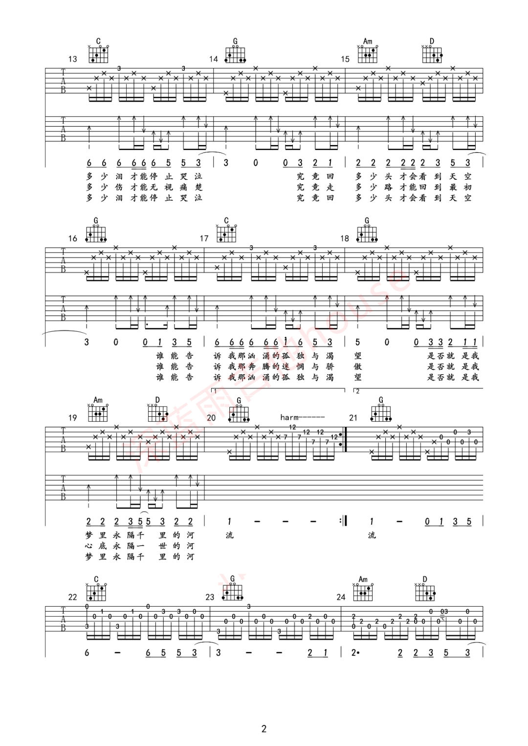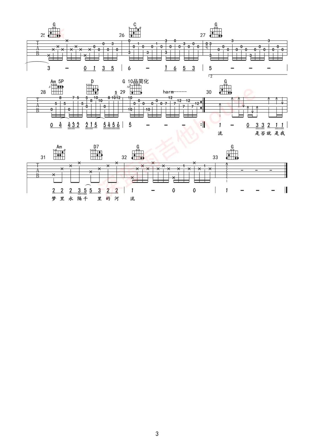 曲谱介绍: 汪峰《河流》吉他弹唱谱,采用G调指法编配原版,共有3张高清图谱。