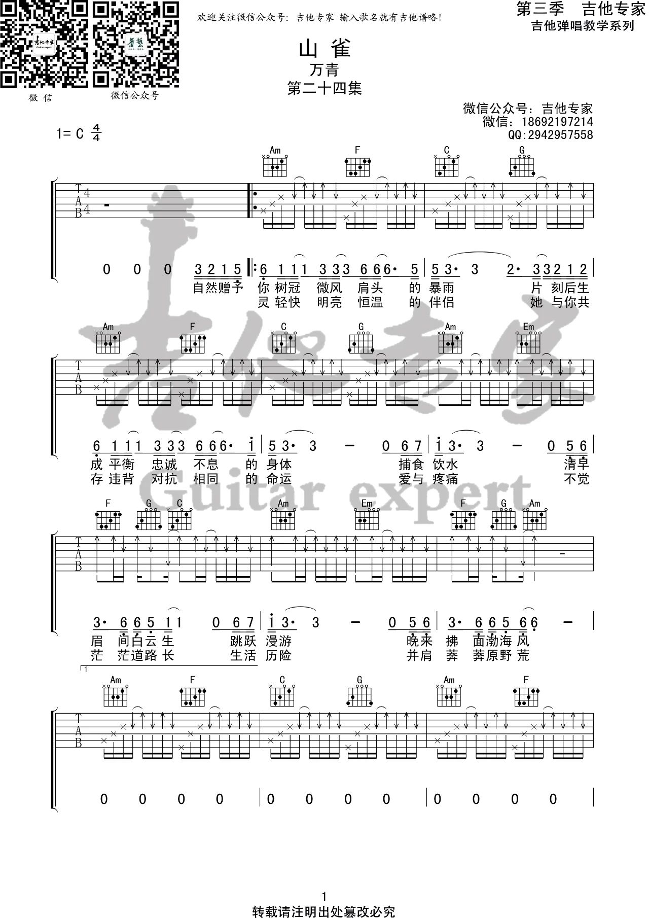 曲谱介绍: 万能青年旅店《山雀》吉他弹唱谱,采用C调指法编配,共有3张高清图谱。
