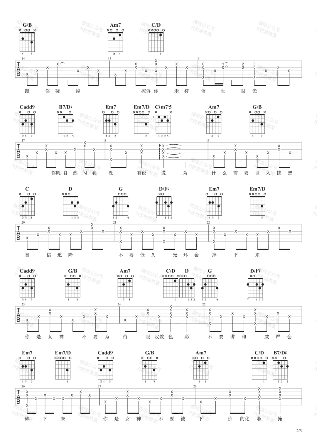 曲谱介绍: 郑欣宜《女神》吉他弹唱谱,采用G调指法编配原版,共有3张高清图谱。