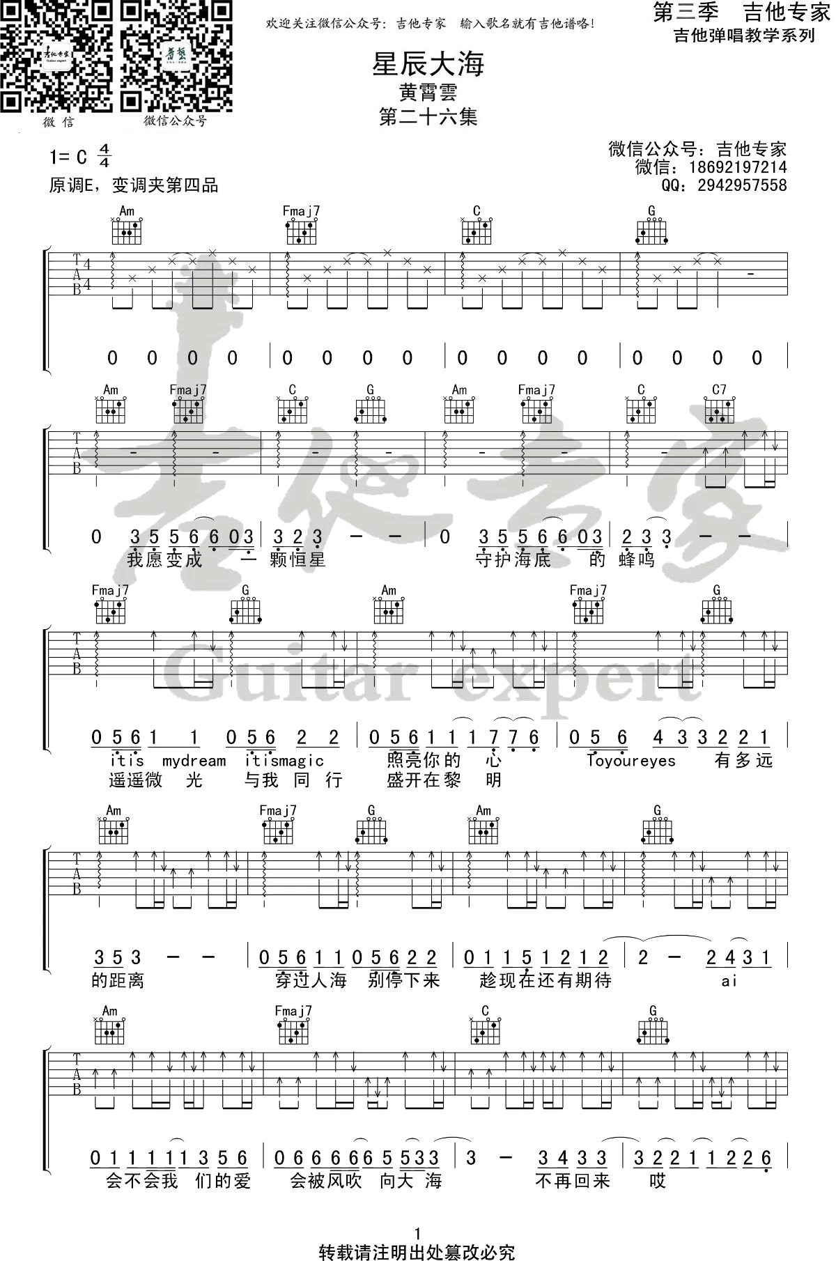 曲谱介绍: 黄霄云《星辰大海》吉他弹唱谱,采用C调指法编配,共有2张高清图谱,免翻页排版设计。