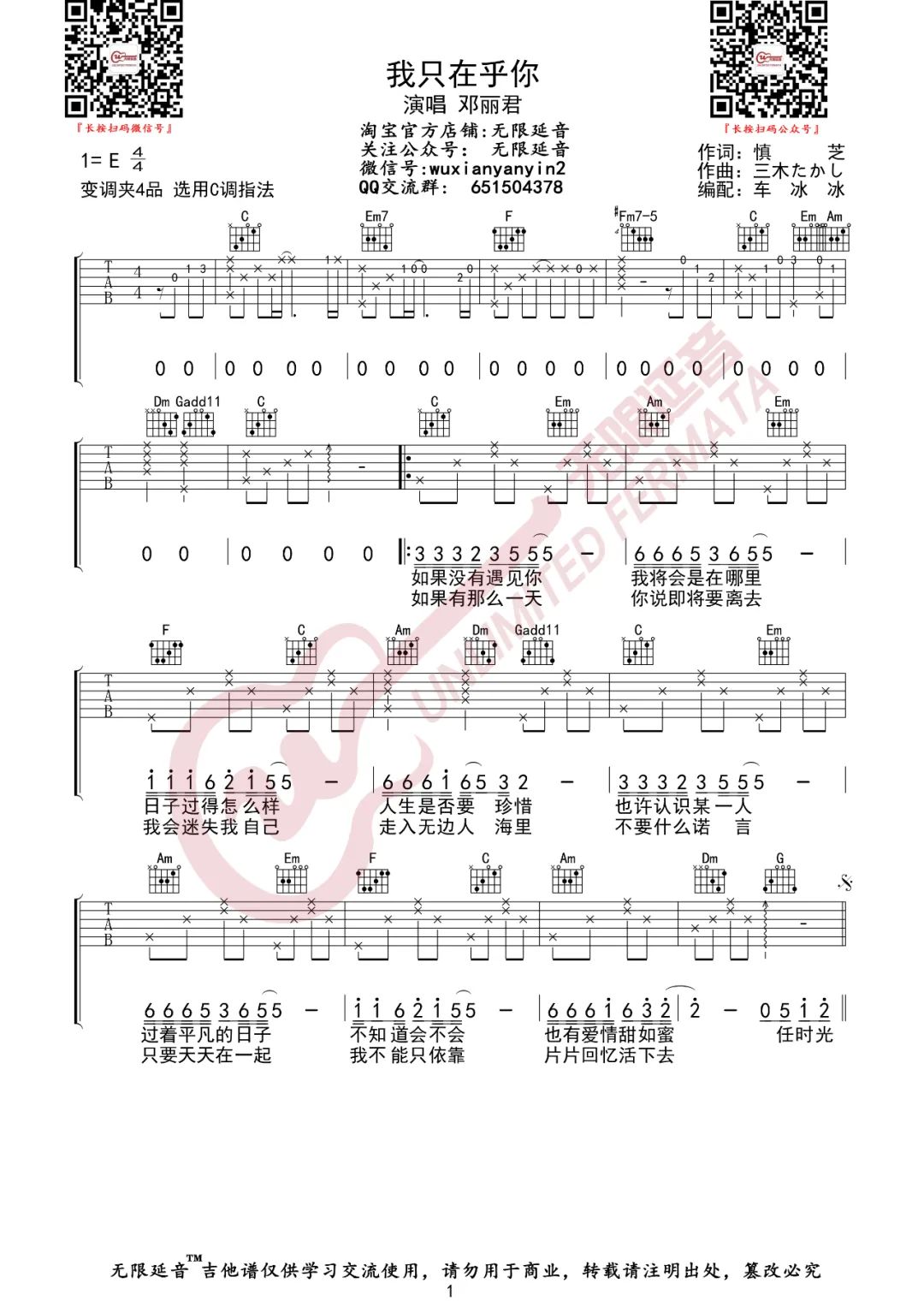 曲谱介绍: 邓丽君《我只在乎你》吉他弹唱谱,采用C调指法编配,共有2张高清图谱,免翻页排版设计。