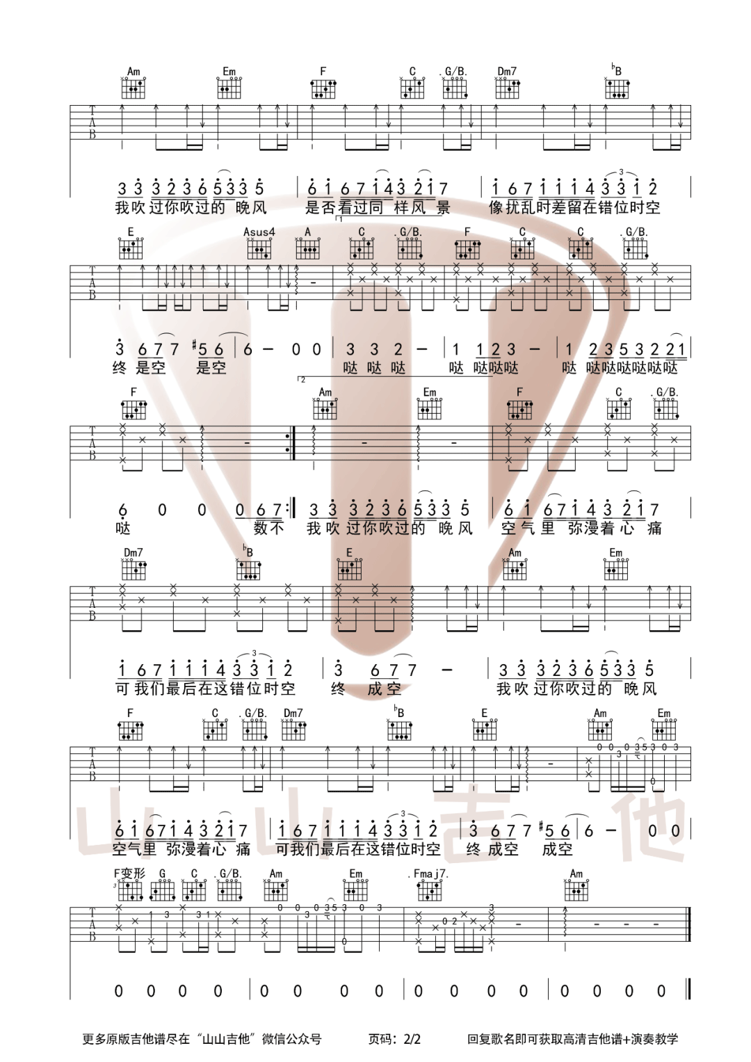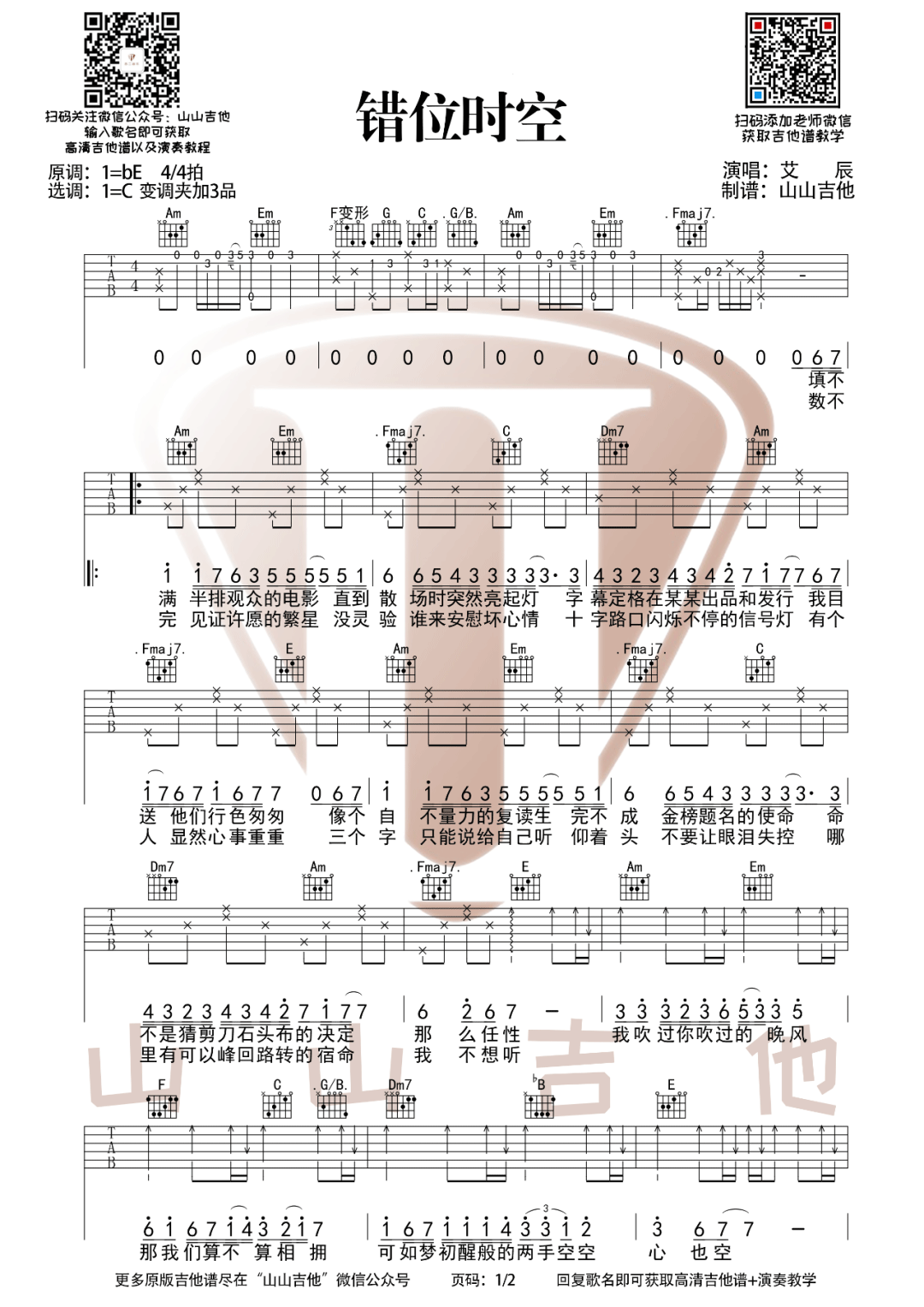 曲谱介绍: 艾辰《错位时空》吉他弹唱谱,采用C调指法编配,共有2张高清图谱,免翻页排版设计。