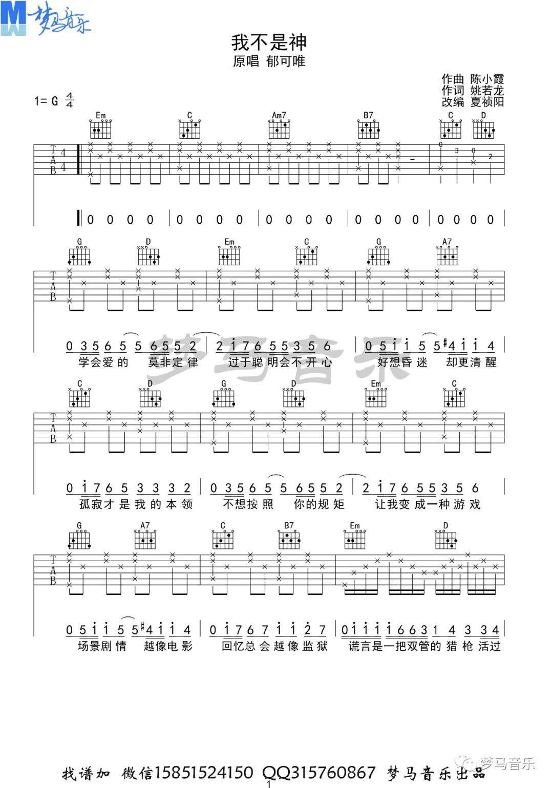 曲谱介绍: 郁可唯《我不是神》吉他弹唱谱,采用G调指法编配,共有2张高清图谱,免翻页排版设计。