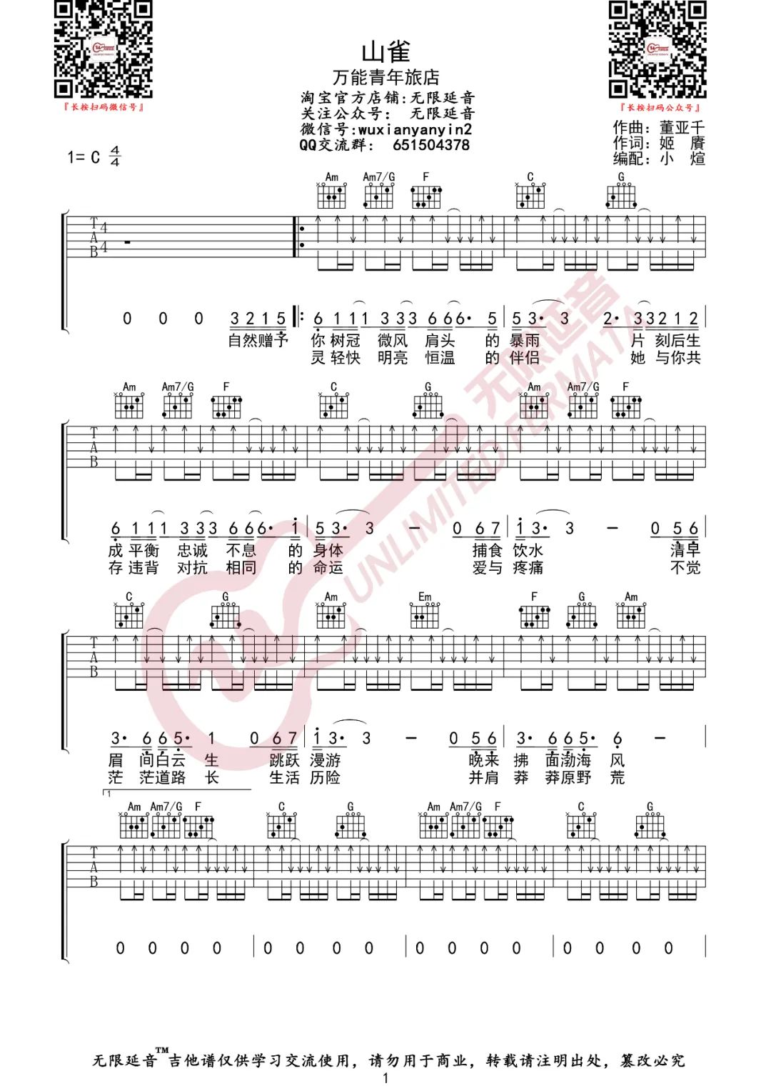 曲谱介绍: 万能青年旅店《山雀》吉他弹唱谱,采用C调指法编配原版,共有3张高清图谱。