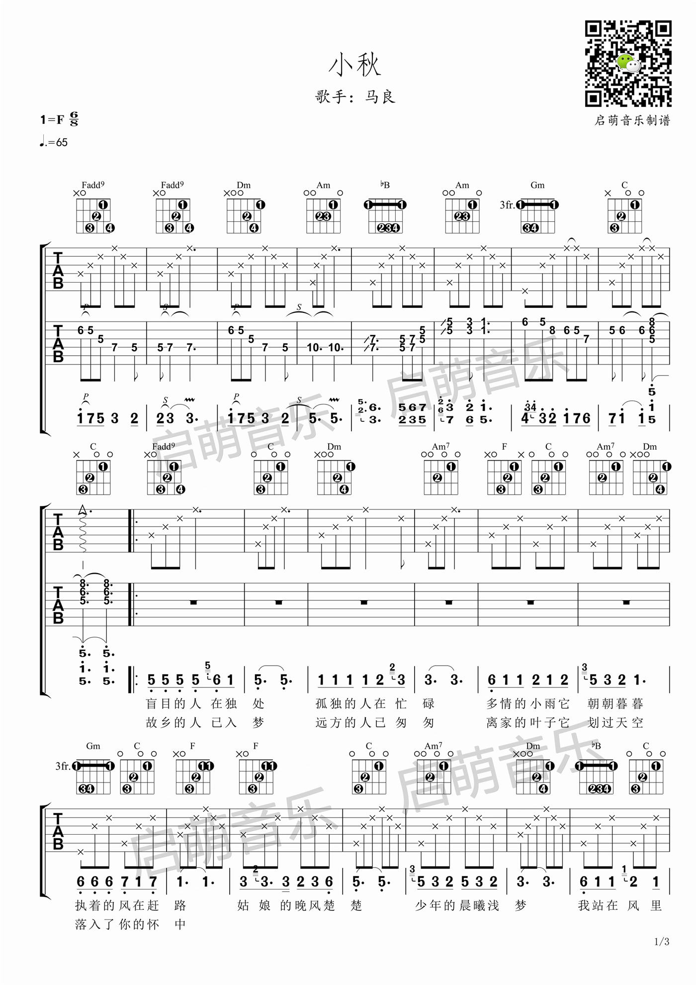 曲谱介绍: 马良《小秋》吉他弹唱谱,采用F调指法编配原版,共有3张高清图谱。