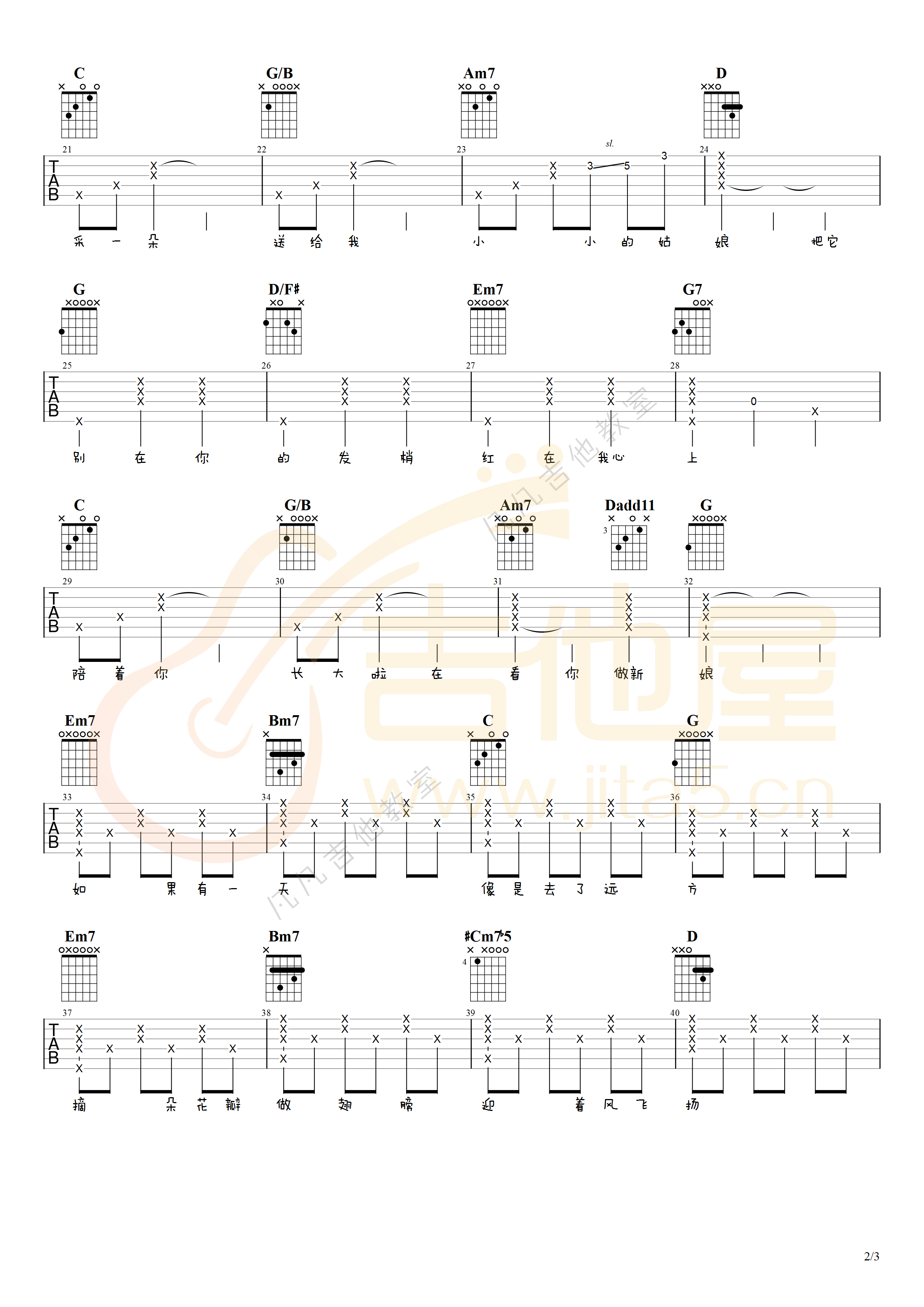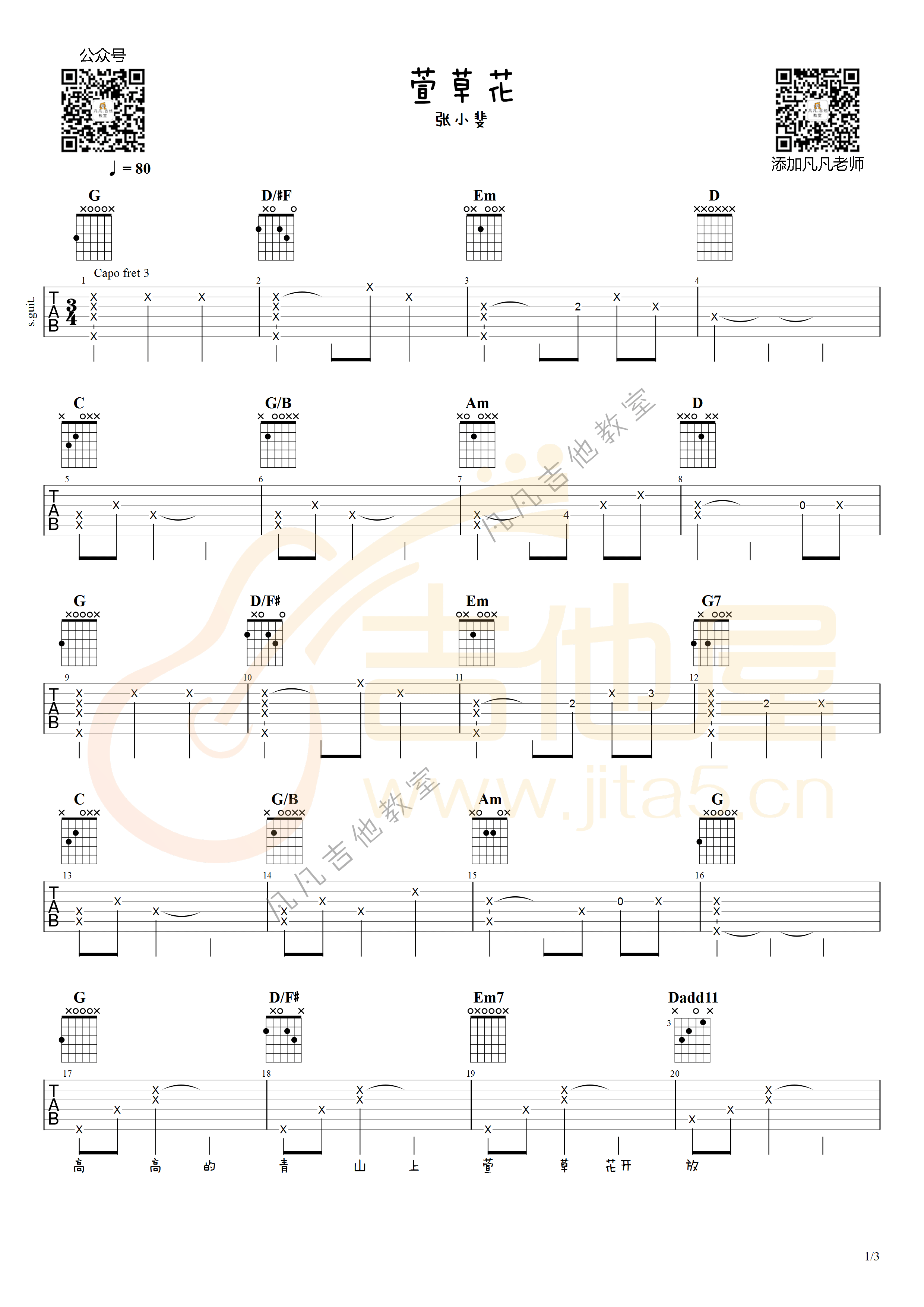 曲谱介绍: 张小斐《萱草花》吉他弹唱谱,采用G调指法编配,共有3张高清图谱。