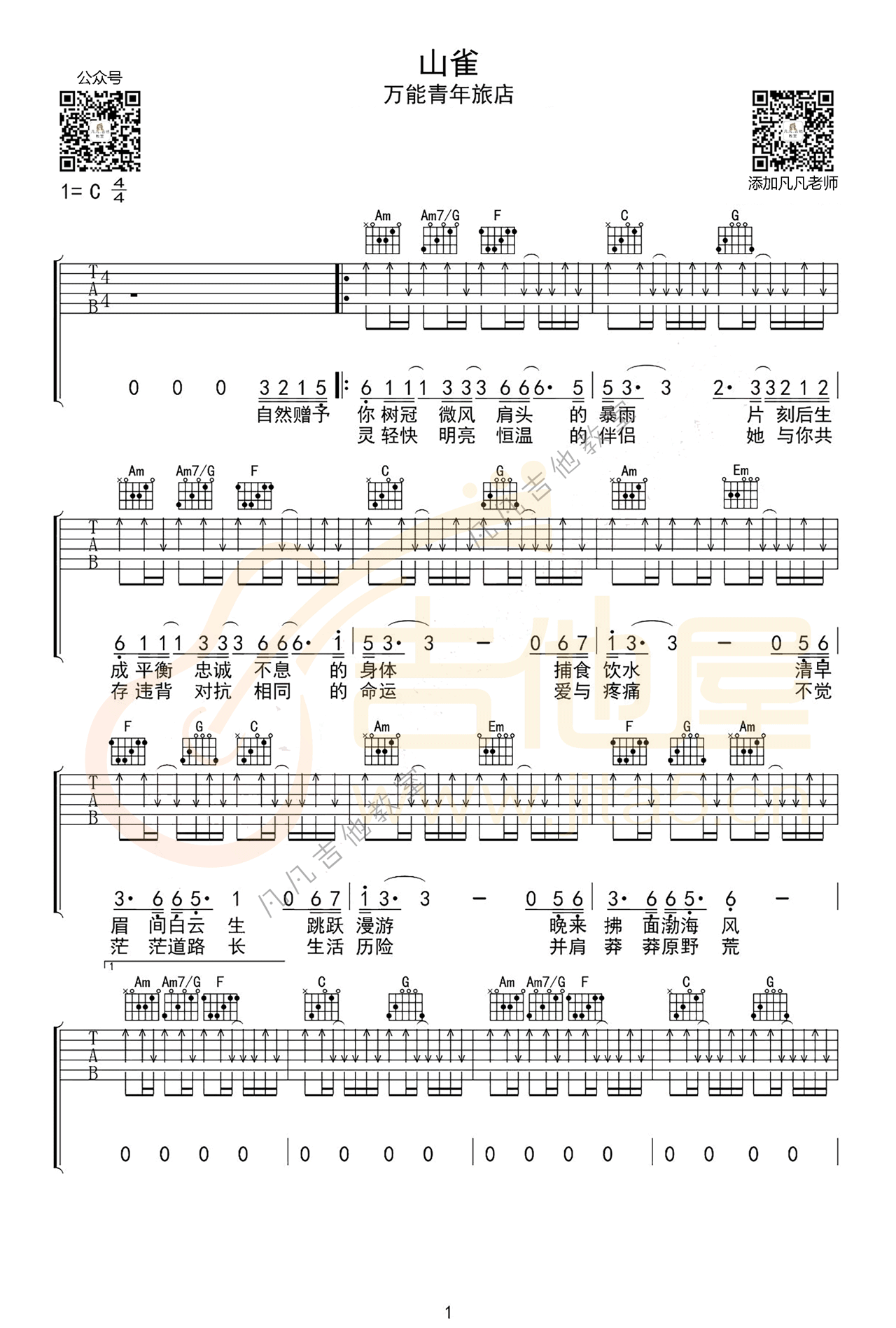 曲谱介绍: 万能青年旅店《山雀》吉他弹唱谱,采用C调指法编配,共有3张高清图谱。