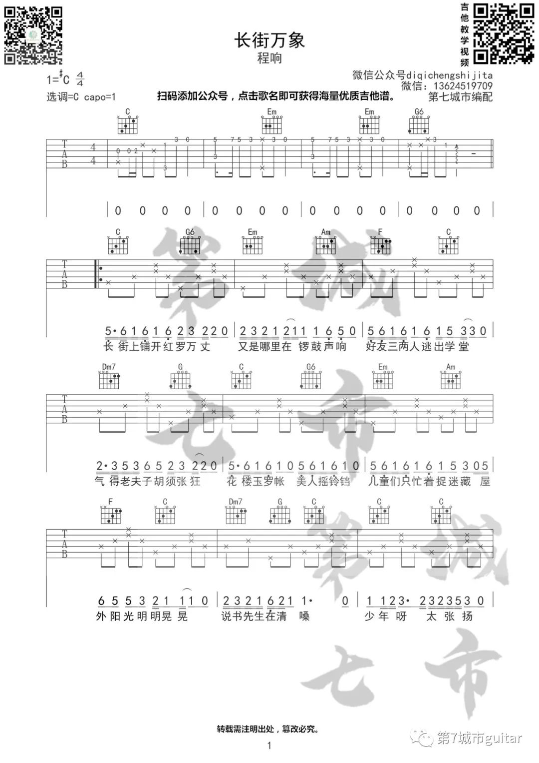 曲谱介绍: 程响《长街万象》吉他弹唱谱,采用C调指法编配原版,共有3张高清图谱。