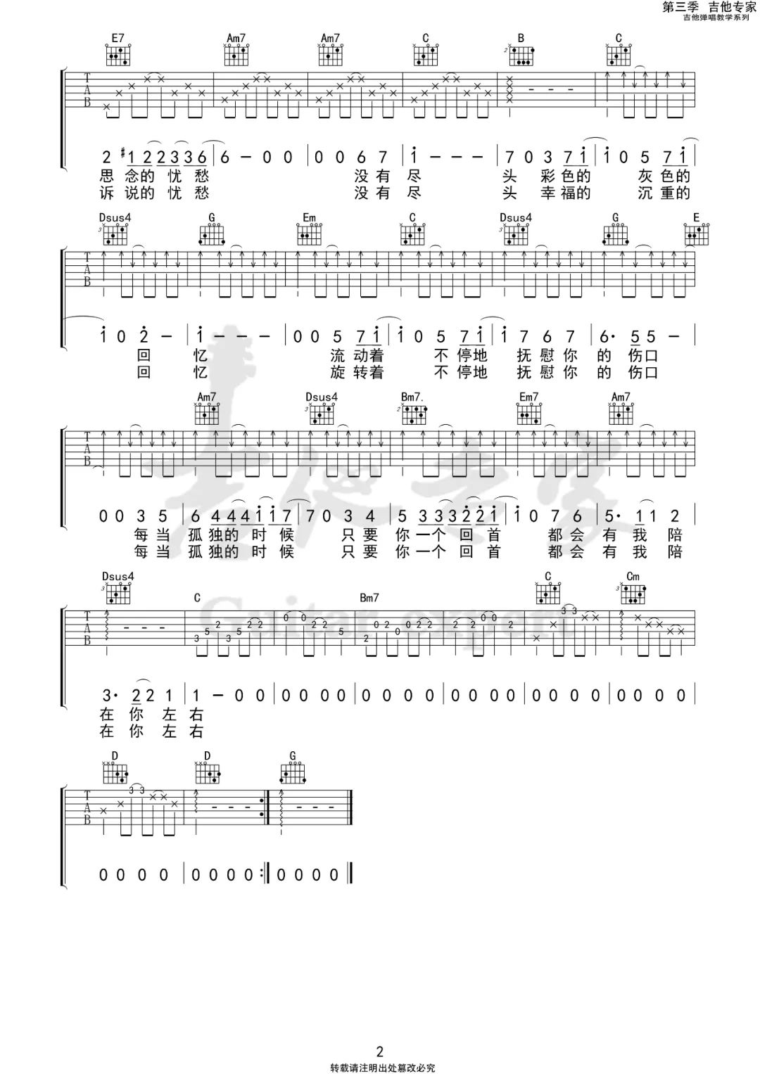 曲谱介绍: 谢春花《陪在你左右》吉他弹唱谱,采用G调指法编配,共有2张高清图谱,免翻页排版设计。